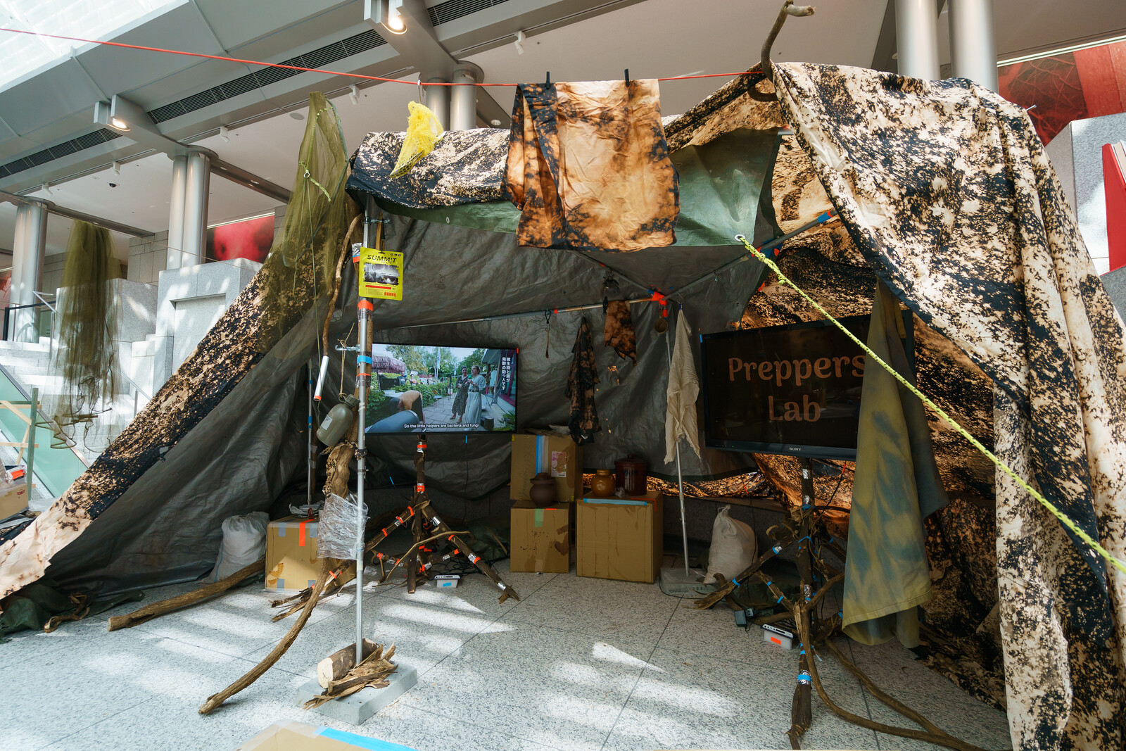 At the center of this constellation stands a strange four-legged figure composed of mismatched showroom dummy parts. Pippa Garner’s Human Prototype (2020) rhymes with Miles Greenberg’s similarly multi-legged sculptures (produced by a 3D printer from scans of the artist taken during a durational performance). Their queering and Afrofuturist tendencies are wonderfully complemented by the Doomsday-hoarder sentiments of Søren Aagaard’s Preppers Lab (2024), a camouflage tent featuring instructive videos alongside not-so-fun facts (“there is a place for every person in a bunker in Switzerland”). Joar Nango, on the other hand, has used solid woodworking and temporary tent structures to create a zone in which the nomadic way of life of the Scandinavian Sami literally invades the postmodern, decorative horizontal furrows of Tange’s architecture (Ávnnastit/Harvesting Material Soul, 2024).