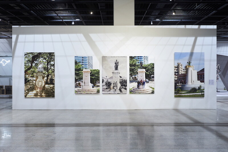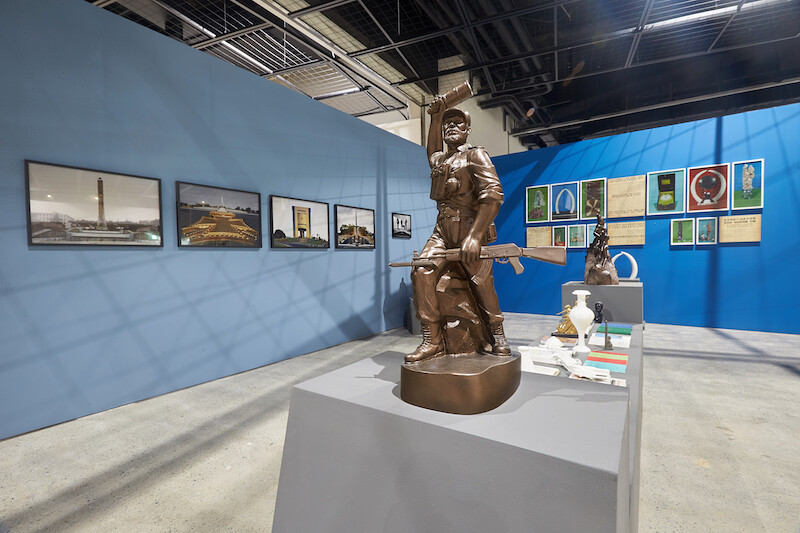 Che has another work on view, International Friendship (2017–18), an installation of documentation, ephemera, photos, and 3D-printed objects referring to an eponymous exhibition of gifts from world leaders to Kim Jong-un’s father and predecessor, Kim Jong-il, and his father Kim Il-sung. The work underscores Kim Il-sung’s effort to make alliances, particularly in African countries where the balance of power was teetering wildly. It is installed next to a wall of photos by Kiluanji Kia Henda, from his “Homem Novo” [New Man] series (2010–ongoing), which has been exhibited in several international exhibitions, depicting pedestals where monuments were razed in the process of decolonization in his hometown of Luanda, Angola.