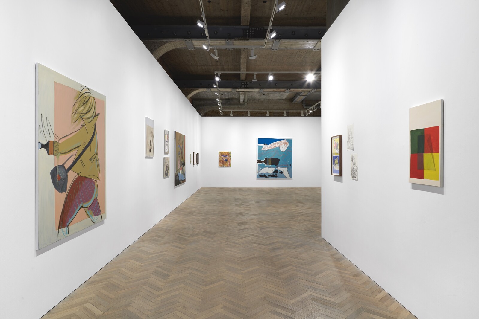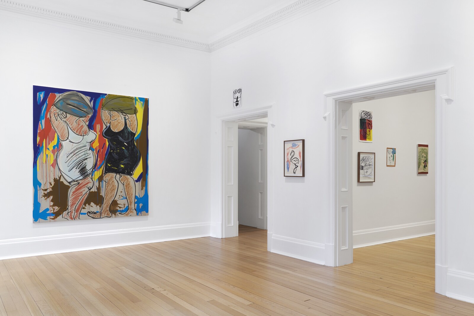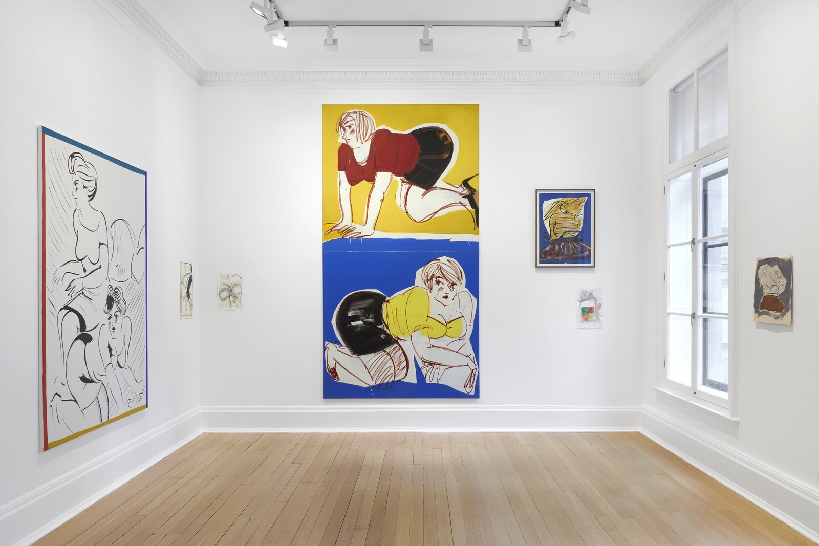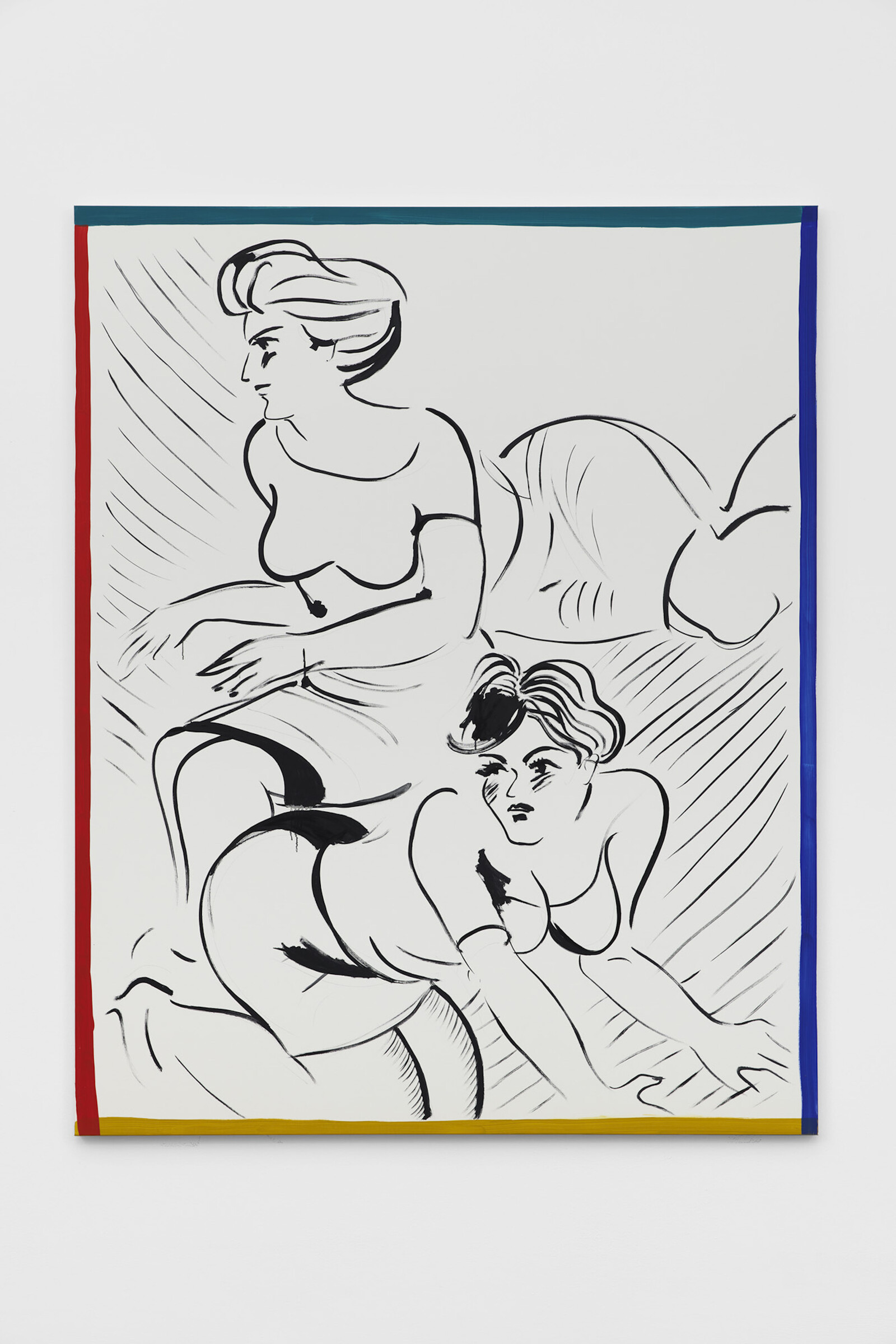 Ella Kruglyanskaya’s “This is a Robbery” reopened at Thomas Dane this week, having migrated to the gallery’s website when Covid-19 hit London in March. The transition from a physical to an online exhibition space heightened the intimacy of works—paintings in egg tempera or oil on canvas alongside smaller compositions on paper—in which female characters relate with a closeness that has come, in a time of social distancing, to seem unfathomable. Women lounge around on top of each other, strut side-by-side, or stand in gossipy cohesion. These pictures celebrate women’s bodies while sternly resisting objectification: their forms are hard-curved and muscular, with gazes that are both vulnerable and tough. In the paintings’ complex compositions—in which the artist engages with the traditions of still life, trompe l’oeil, and memento mori—these bodies exist for themselves. In one painting, framed by blue, yellow, and red, women’s limbs merge to create a commingled female form—a multiple-legged structure that resembles an optical illusion. In other paintings, shapes morph into more abstract structures or blend with their surroundings. These manipulations of form dislocate our expectations of what we might expect of gendered bodies in painting.
