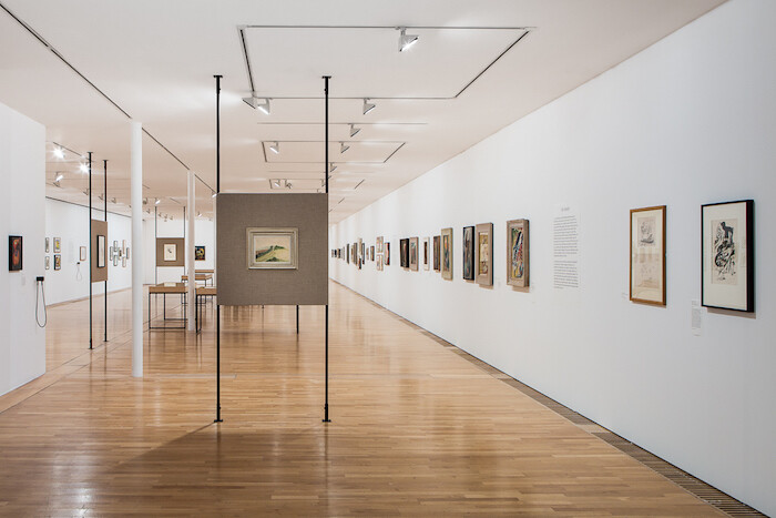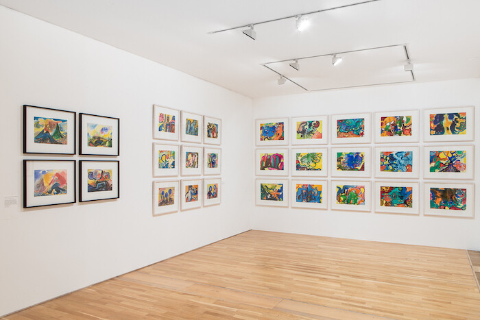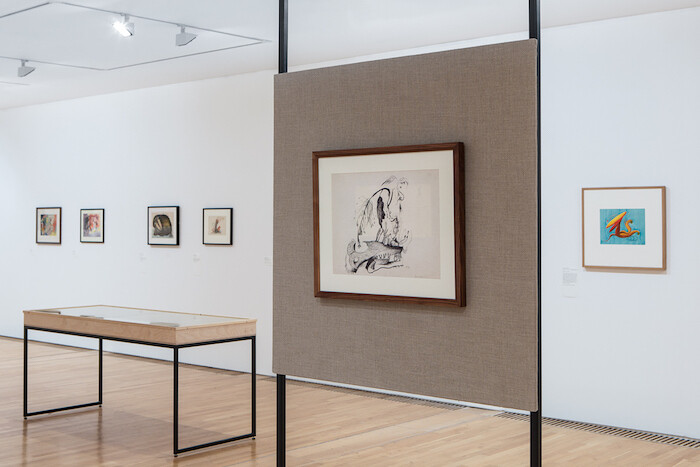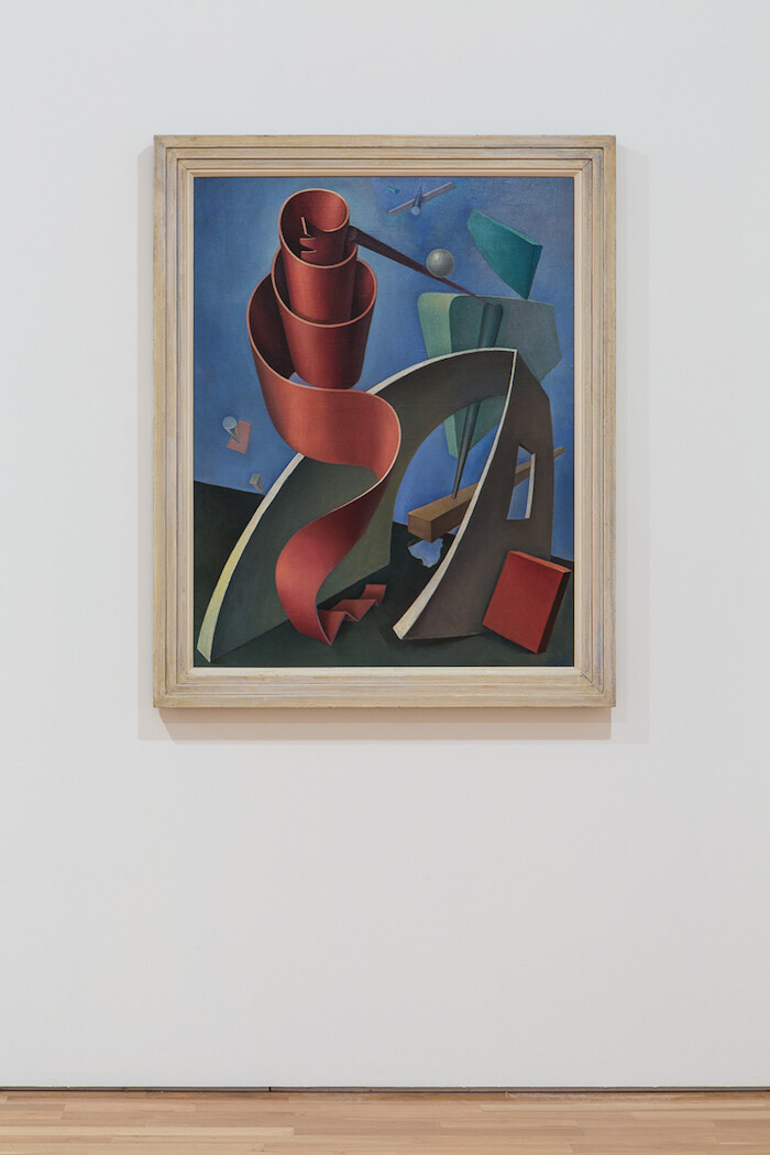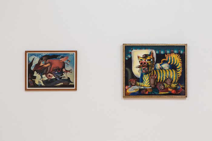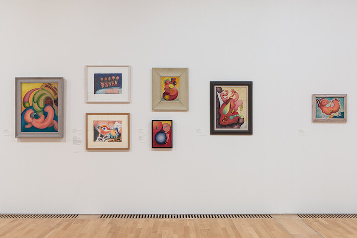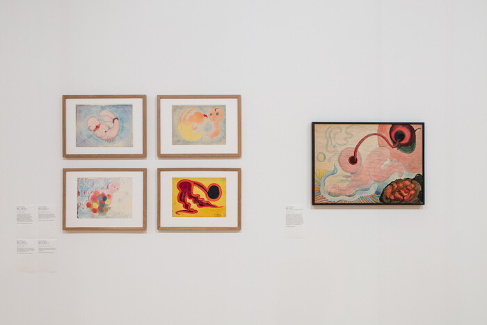 The main analyses of their early work from 1935 to 1938 focused on birth, weaning, and sibling rivalry. Pailthorpe annotated images and wrote extensive lectures based on paintings by Mednikoff, diagnosing his aggression and anger as having origins in the Oedipal rage of the “ex-baby”: an older child who competes with both his father and his newborn sibling for the mother’s affection. A wall text explains that Pailthorpe described Arboreal Bliss, a painting made by Mednikoff in a session dated April 23 and 24, 1935, as “a symbolic breast-feed… [the] yellow hue reflects the warmth pervading the child’s body.” Pailthorpe’s paintings Crustacean Caress (1935) and Standbumptious (1937), meanwhile, visually embody her writing on “intellectual hermaphroditism”—a meeting of both male and female minds—by portraying liminal beings with male and female genitalia. Such hallmarks are found in much of the work from this period: biomorphic forms, yonic and phallic shapes, sweeping washes of color. Mednikoff’s The Red Arteries (1934) engages with the visceral fluidity of the bloodstream: deep red arteries course down the center of the canvas as if through a human torso, which he interpreted as his infantile yearning to swim inside his mother’s body. Mednikoff’s obsession with mother figures could also be configured in relation to the work of a contemporary fellow psychoanalyst, Melanie Klein, particularly the notion of the infantile desire to scoop, suck, destruct, and devour the breast.