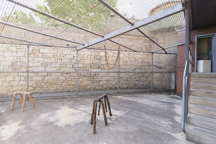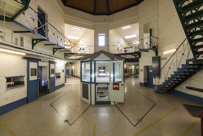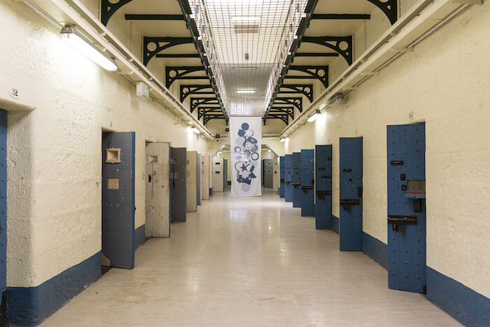 Steven Rhall’s Visibility is a Trap (2018) sees light differently—blinding as much as revealing. In the octagonal observation booth at the heart of the panopticon, local historians have excavated part of the floor, attempting to unearth the graves of prisoners hung on site. Digging in prisons usually indicates escape—but this hole bespeaks introspection, rather than freedom. Rhall lights the whole thing up with fluorescent strips, like a miniature stadium, watching the watchers.