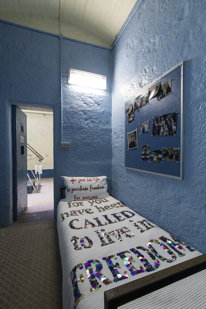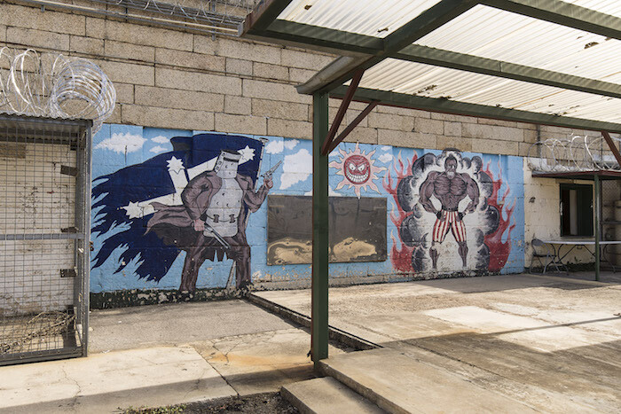 Bindi Cole Chocka is among them. Her EH5452 (2012–2018) is a restaging of a video installation originally commissioned by artist Brook Andrew in 2012. Inside a woman’s cell at the prison, Chocka has covered a bedspread and cushions with phrases picked out in multicolored sequins, one proclaiming “Jesus wept.” A video projection shows the artist in cartoon-style prison garb, reading in a singsong, children’s television style from her own real-life prison diary. Incarcerated as a young woman for drug convictions as the eponymous number EH5452, Chocka’s rehabilitation involved conversion to Christianity, a path she has stayed on ever since. In a white cube gallery, EH5452 would be cloying. In this decrepit cell, it’s a ray of sunshine.