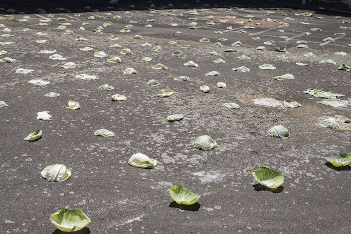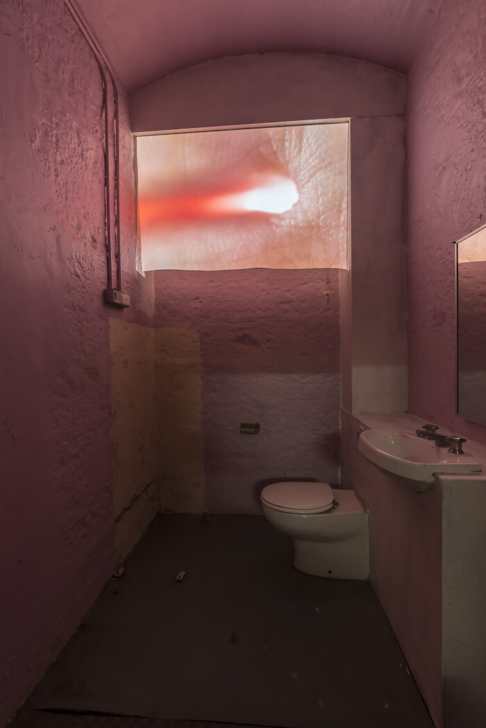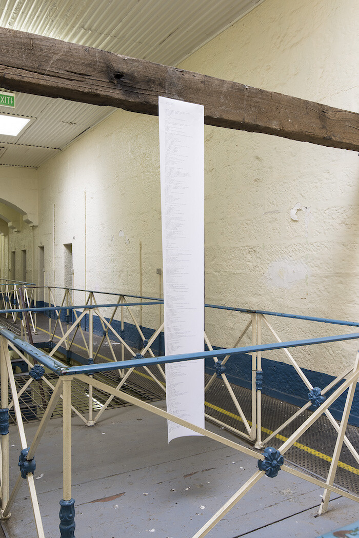 Outside, in the exercise yard, cabbage leaves are neatly laid out to dry in the searing summer heat. Katie West pounds these leaves with pulp to make paper that dries in the sun: blank pages for unwritten histories. West’s collaboration with Fayen D’Evie, The Museum Incognita (2018), sidesteps the dominant mythologies of white Australia to tell “the stories of others”: tales of Chinese indentured labor, market gardeners, and cooks—the overlooked and the unsung. Aesthetics of care reappear in Isadora Vaughan’s Aves (2018), in which pieces of furniture are covered in birdseed. Recalling a recovery program for birds of prey undertaken by prisoners, it also offers a reminder of the normalized imprisonment of animals. Entrapment in one’s own body is inferred by Tara O’Conal’s poetic video Body Hole (2018): slivers of light filtering through closed fingers, projected high onto the window of a mauve-painted cell. Literal poetry is also on offer. Melbourne writer Ender Baskan’s No Body Politic (2018) is a surreal take on Kelly’s literary effort known as the “Jerilderie Letter” (1879), in which he attempts to justify his actions. Superimposing Kelly with Ai Weiwei and Genghis Khan, and the Old Beechworth Gaol with the Great Wall of China, Baskan’s poetic rant is printed to match the length of Kelly’s body and “hung” in the upper cell hall gangway at the exact location of the original gallows site.