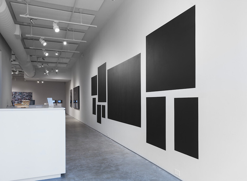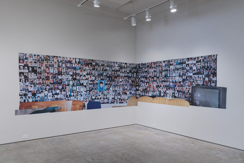 The exhibition is bifurcated: on the largest wall of the narrow gallery, Ramírez Jonas has painted eight large black rectangles, which are meant to represent the absence of eight Western European paintings destroyed over the course of World War II by both sides and, thus, to illustrate his curatorial intervention. Past these voids and into the gallery, eight artworks are installed simply but effectively. A new work by Aida Šehović, Family Album (ŠTO TE NEMA): Wall 6 and 7 (2018), covers the gallery’s back corner with a one-to-one scale photographic reproduction of two walls in the Women of Srebrenica Association office, a nonprofit dedicated to identifying the victims of the Srebrenica massacre in Bosnia in 1995. The majority of the photo-mural is devoted to rows upon orderly rows of 4 x 6 photo snapshots of missing men that line the office, each a reminder of absence and collectively a testament to the scale of the genocide.