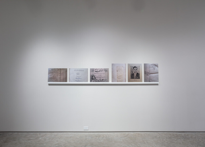Six photographs from Emily Jacir’s “Untitled (fragment from ex libris)” (2010–12) are printed from cell phone photos the artist took of books held by at the National Library of Israel. The books she documents were designated as abandoned property and are part of a collection of nearly 30,000 volumes which once stood on the shelves in Palestinian homes and were seized by Israeli authorities in 1948. Jacir’s camera closes in on handwritten marginalia in order to try and focus the viewer’s attention not only on the books as objects displaced from their proper socio-linguistic histories, but also as objects that once belonged to individuals rather than to an ethnic identity writ large and in the abstract.