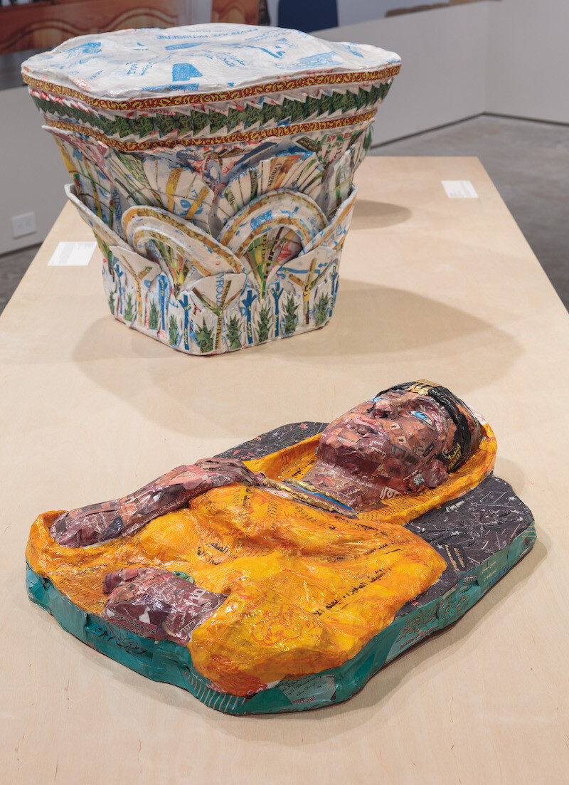 The artworks Ramírez Jonas has curated into “A Void” resist his universalizing premise by systematically implicating the audience in the void being represented. One example is Michael Rakowitz’s “May the Obdurate Foe Not Be In Good Health” (2016), a series of sculptural reproductions of artifacts destroyed or looted during the Syrian Civil War. He does so by reconstructing the fragments of ancient Middle Eastern civilizations out of commercial food packaging imported to the US from Syria. The implication is that the people to whom these ancient objects once belonged are not simply absent from their original context, but have been displaced to the US where they can buy syrup from back home for as long as the conditions of production are still stable enough to export it out of Syria.