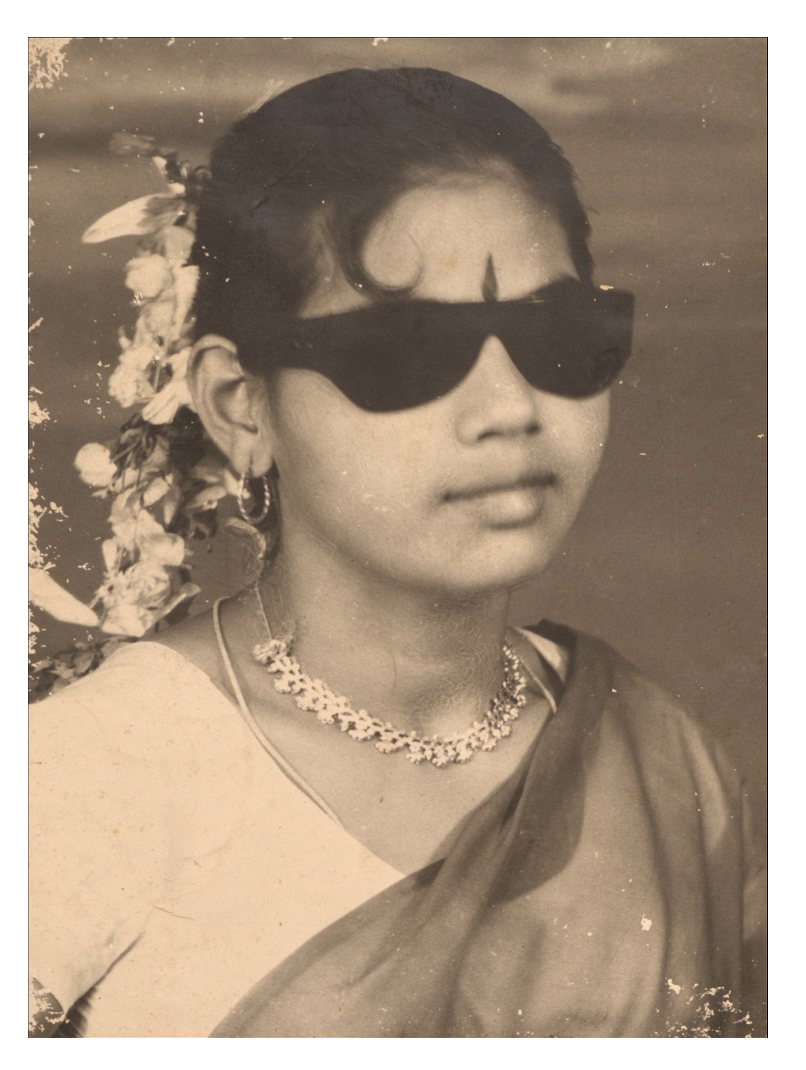 Under close, extended observation, however, the structural logic of the clusters dissolves into a multitude of distinct personalities. A girl wearing flowers in her hair and what appear to be black Wayfarer sunglasses (the artist speculates that they are cut from cardboard); a man with an immaculate, wavy quiff, looking suitably proud; two men standing close together, one holding the other’s shoulders tight.3 There is Akkapeddi’s uncle in his youth with an overpainted moustache which, he admits in the video, “is just a fantasy.” Some couples appear relaxed in each other’s company, others deeply uncomfortable, with expressions that cry: “how did I get here?” Some look alarmed by the camera, others pleased to be immortalized by it.
