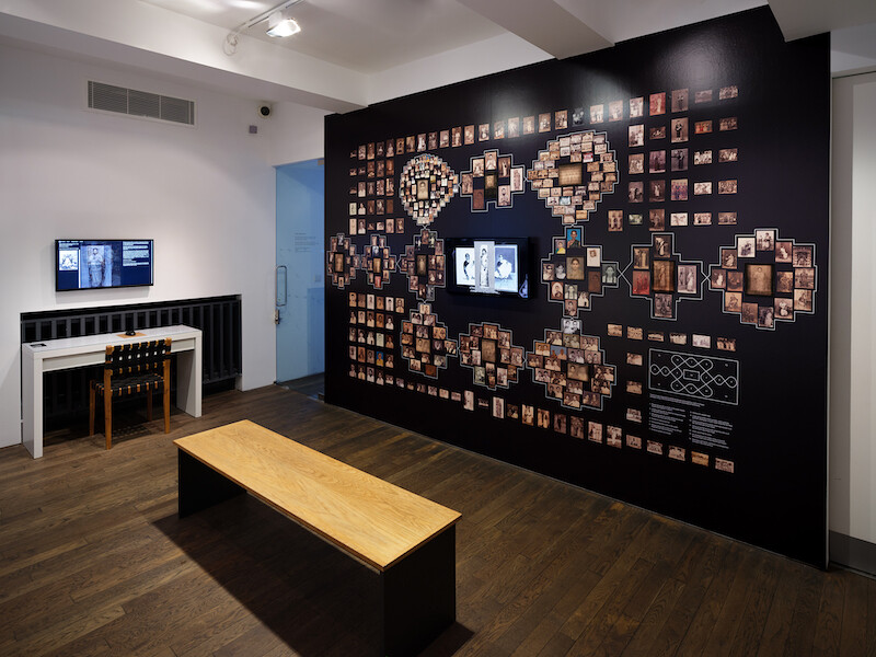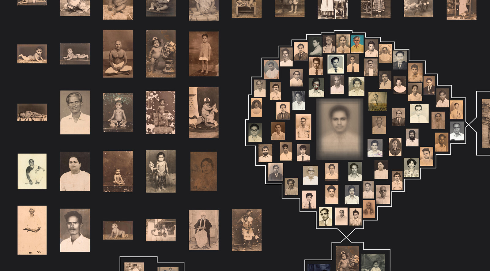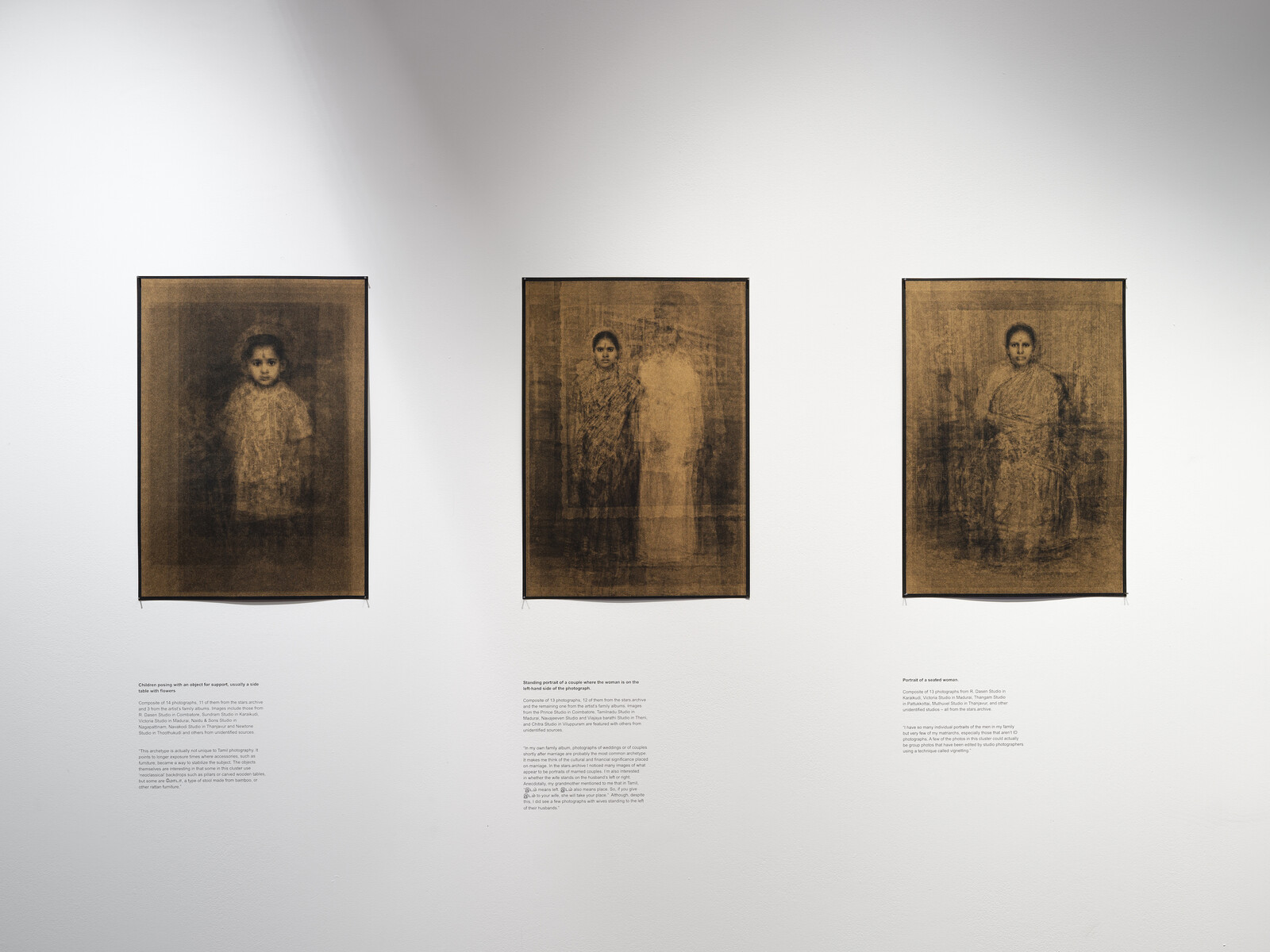 The installation combines Akkapeddi’s family photographs from the south Indian state of Tamil Nadu with those from an archive created by the STARS research collective of Tamil studio photography from the 1880s to the 1980s.1 Akkapeddi used an image classification model called VGG-16 to sort the photographs into a grid based on formal similarity, and then divided them into twelve generic groups: portraits of children propped up by an object, for instance, and close-ups of couples in which the man stands on the left. These “clusters” are arranged across a gallery wall within the interlocking forms of a kolam—a pattern drawn with rice flour at the entrance of Tamil homes to bring good fortune and exclude evil spirits. A larger composite image at the center of each group collates the surrounding photographs as if to identify what they share, while interviews with relatives and researchers feature in a video at the center of the kolam. The resulting display is part science poster, part family tree.
