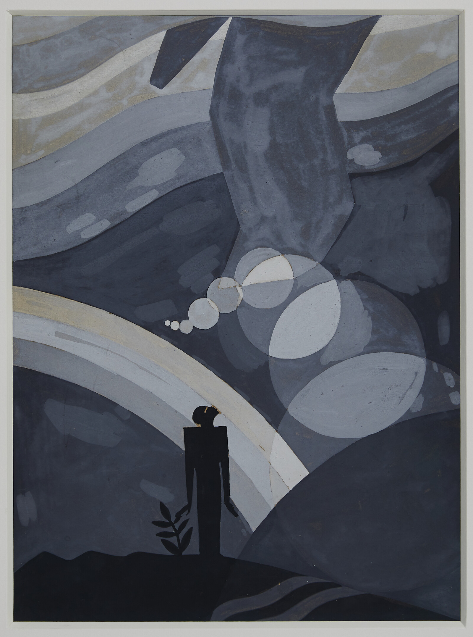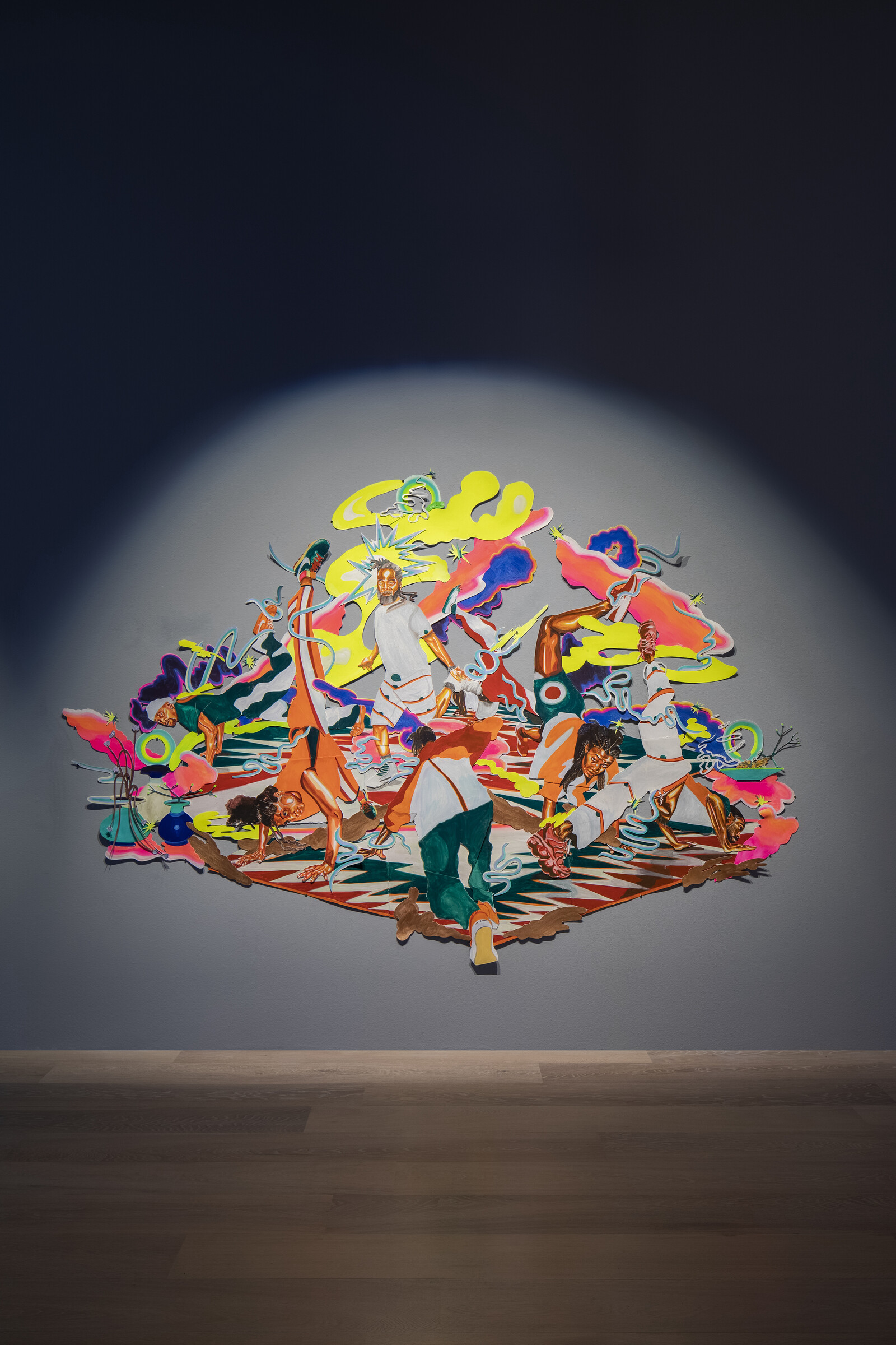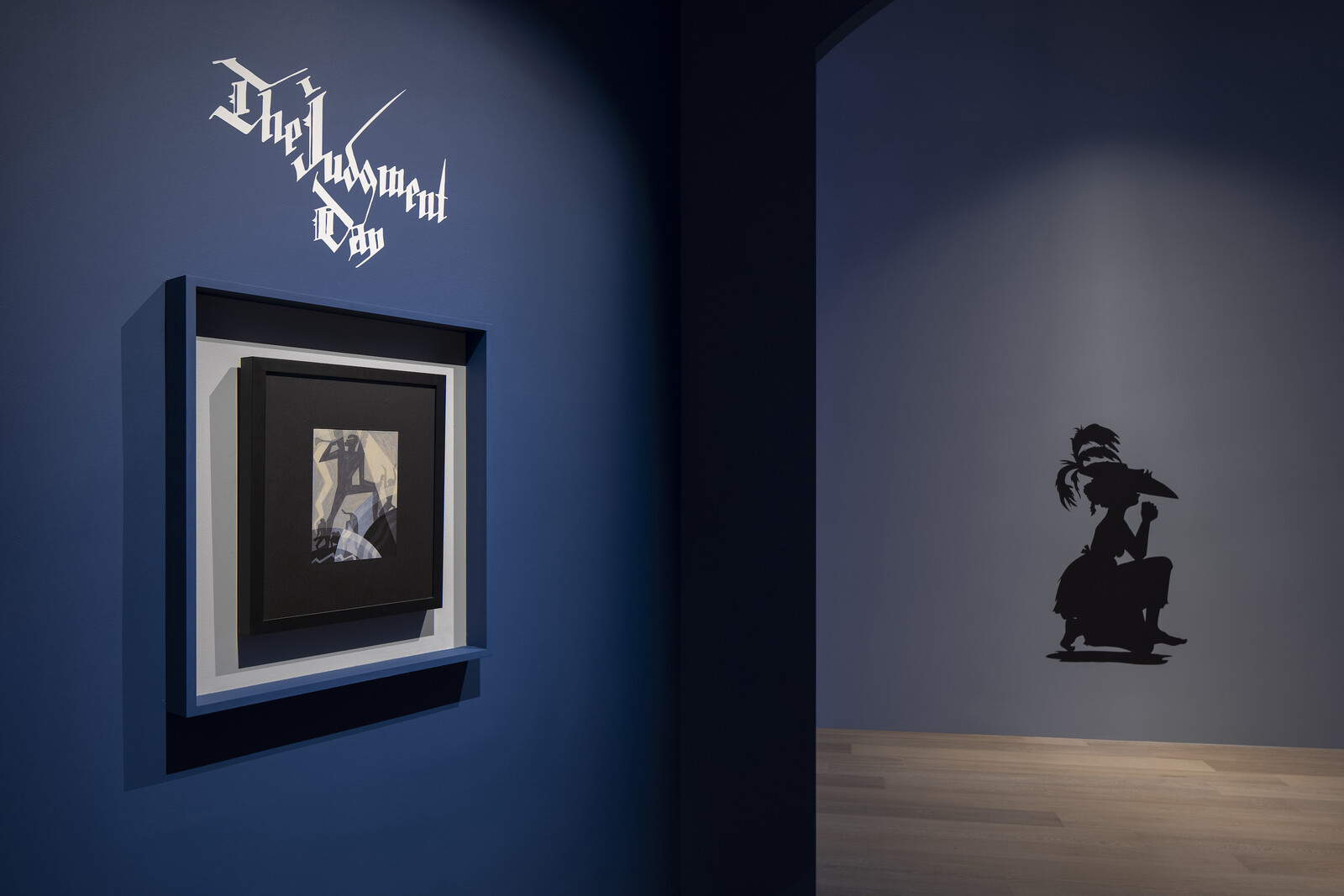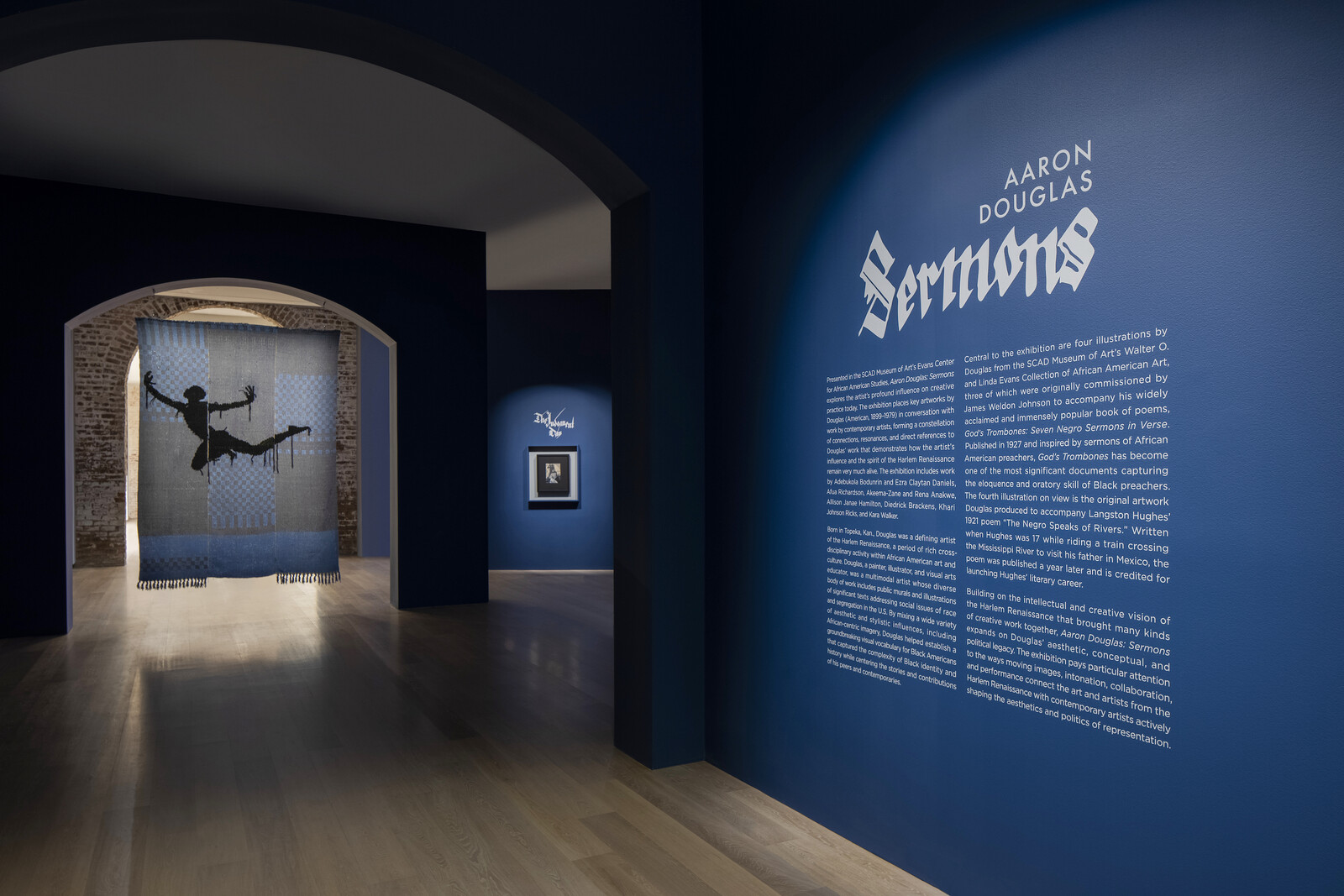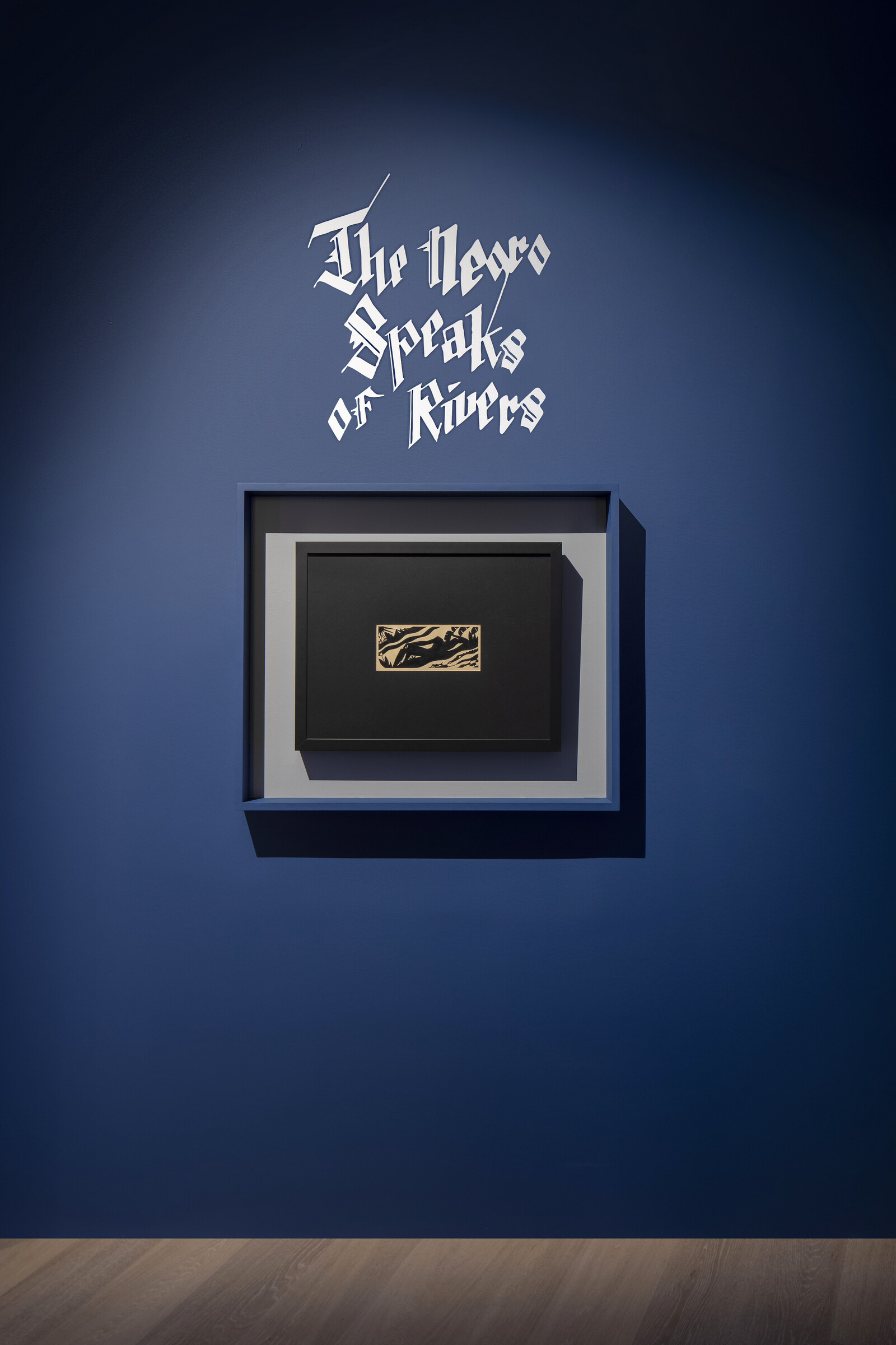 The works on view in this group show, in which several contemporary artists respond to the legacy of Harlem Renaissance-era painter Aaron Douglas, are united by a Black existential affinity with literature and the natural environment. The exhibition is constructed around four works by Douglas from the museum’s Walter and Linda Evans Collection of African American Art that center two of his key interlocutors: James Weldon Johnson and Langston Hughes. Three are illustrations to Johnson’s poetry collection God’s Trombones (1927), a striking articulation of religious oratory, while the fourth illustrates Hughes’s poem “The Negro Speaks of Rivers” (1921), and accompanied its original publication in The Crisis. It’s a poem that Black folks have long held as a psalm, its closing lines reverberating across generations— I’ve known rivers: / Ancient, dusky rivers. / My soul has grown deep like the rivers. This meeting of Black thought, art, and letters—a history of cross-disciplinary connection—sets the stage for the contemporary works in the show, and guides the exhibition’s curatorial framework.
