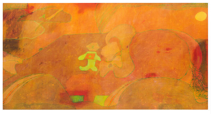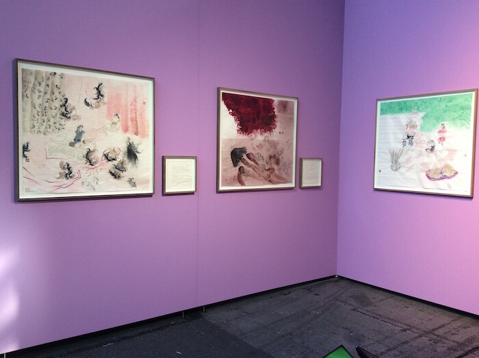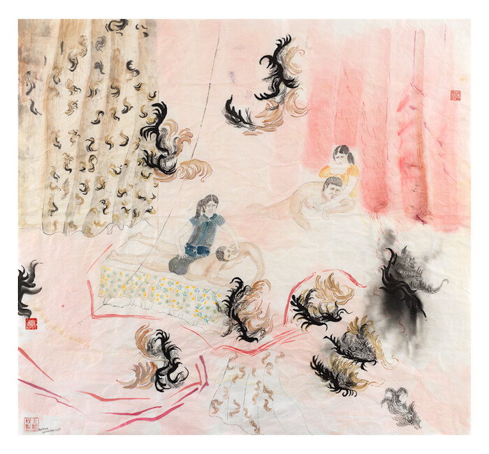 Also exceptional is a solo presentation of works by Amsterdam-based Taocheng Wang at Amsterdam’s Galerie Fons Welters. In it, Wang records her experiences working part-time at a local Chinese massage parlor with a series of framed paintings and hand-written texts on rice paper. A Hongkong-Dutch client licking my arm during the massage treatment (2015) shows exactly that, in a flat and dreamy space, among a soft pattern of black and gold flourishes. The anecdotal texts speak to mutual support among the artist’s female colleagues in contrast to the lack of basic decency exhibited by their clients. Written in an imperfect English, one text contains the following passage: The man’s sunglass was looking at me up and down, it took half a minute, I piled up smiles and he suddenly said, “You were a guy before! I can recognize it actually. I mean, you were a guy!” Suny and Tracy immediately shouted out: “Sir! If you don’t want to have a massage, please leave our salon immediately! The door is open for you! And you should know how to speak well in front of ladies!” Wang’s body, and its gender performance, are subject to the client’s scrutiny—a small but exemplary reminder of the degree to which people assume the public is entitled to the bodies of women, especially those of color, especially at work in service industries.