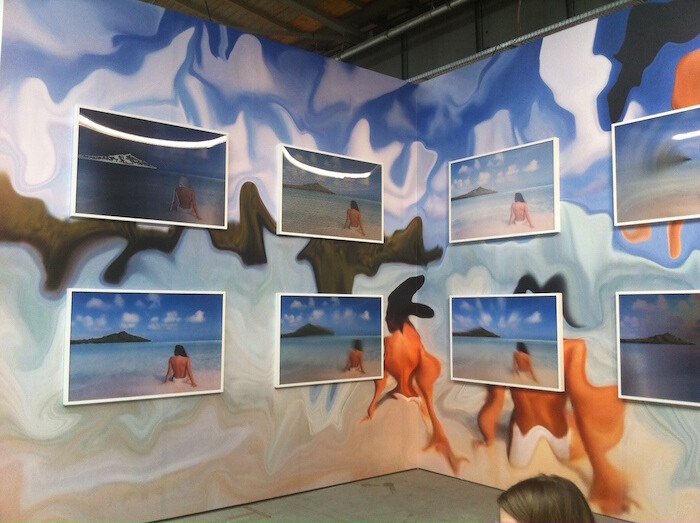 The same entitlement is exhibited in Constant Dullaart’s presentation at the local Future Gallery, where the booth consists of a single image—that of a white woman sitting topless on an empty beach, her bare back facing the camera—distorted into a series of lenticular prints, as well as a wallpaper display. “Jennifer in Paradise” (2015) takes as its material “the first photograph ever to be photoshopped,” according to the gallery’s press release; it was taken by Photoshop co-creator John Knoll of his wife, Jennifer. I wonder if there wasn’t another way of exhibiting Dullaart’s research into the history of digital photography and manipulation, one in which the image’s provenance is paramount to pleasure in looking at naked female bodies? Why does this still happen? It’s 2015, and generally people now understand that using images of women in service of some greater artistic narrative is as boring as it is retrograde.