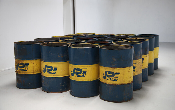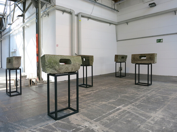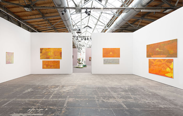 Nearby is Lydia Ourahmane’s large-scale installation The Third Choir (2014) at Dublin gallery Ellis King, a rectangular arrangement of 20 empty barrels imprinted with the logo of Naftal, an Algerian oil company, imported from Algeria. Inside of each, at the bottom, is a cheap Samsung cell phone. A central barrel contains a radio transmitter that relays a sound piece to each phone; amplified by each of the barrels, it’s a spacey, minimal, low-fidelity chorus. At Berlin’s Croy Nielsen, Mandla Reuter also makes use of ambient atmospherics with Confusion Mystery (2015), a lamp installed on the ceiling that suddenly changes, every half-hour, from a warm yellow light to a harsh, fluorescent, bluish one. It illuminates five sculptures, each titled Drain (2015): granite slabs that have been hand-carved into regular gutters and mounted on tall metal frames. Sparsely positioned, these humble gutters take on a kind of minimalist austerity, an impression that speaks to the transformational potential of contextual information. As in the exhibition of any kind of art—at a fair, or wherever else—things can change dramatically in the right light.