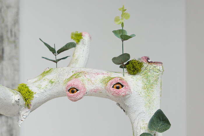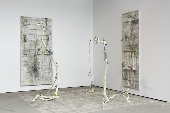Authorship likewise makes a thematic appearance at the booth of Leipzig’s Galerie Tobias Naehring, where Berlin-based Lukas Quietzsch’s series “Kevin Kemter “BABYDOGG 1,000,000” produced by Lukas Quietzsch” (2015) translates the drawings of a fellow artist into paintings, though the question of authorship here isn’t really as interesting as how weird and unexpected the paintings are. A similar sense of surprise characterizes Viet Laurent Kunz’s presentation at Johan Berggren Gallery, Malmö, where painting and sculpture incorporate wood, plaster, graphic elements, and simulated natural materials. Three white works stand upright like plaster-covered trees, decorated with minute appendages: a small, carved hand, some glass eyeballs, fake flora, some steampunk tube things. The assemblage is precious and the scale is confusing, like a cool fairy landscape.
