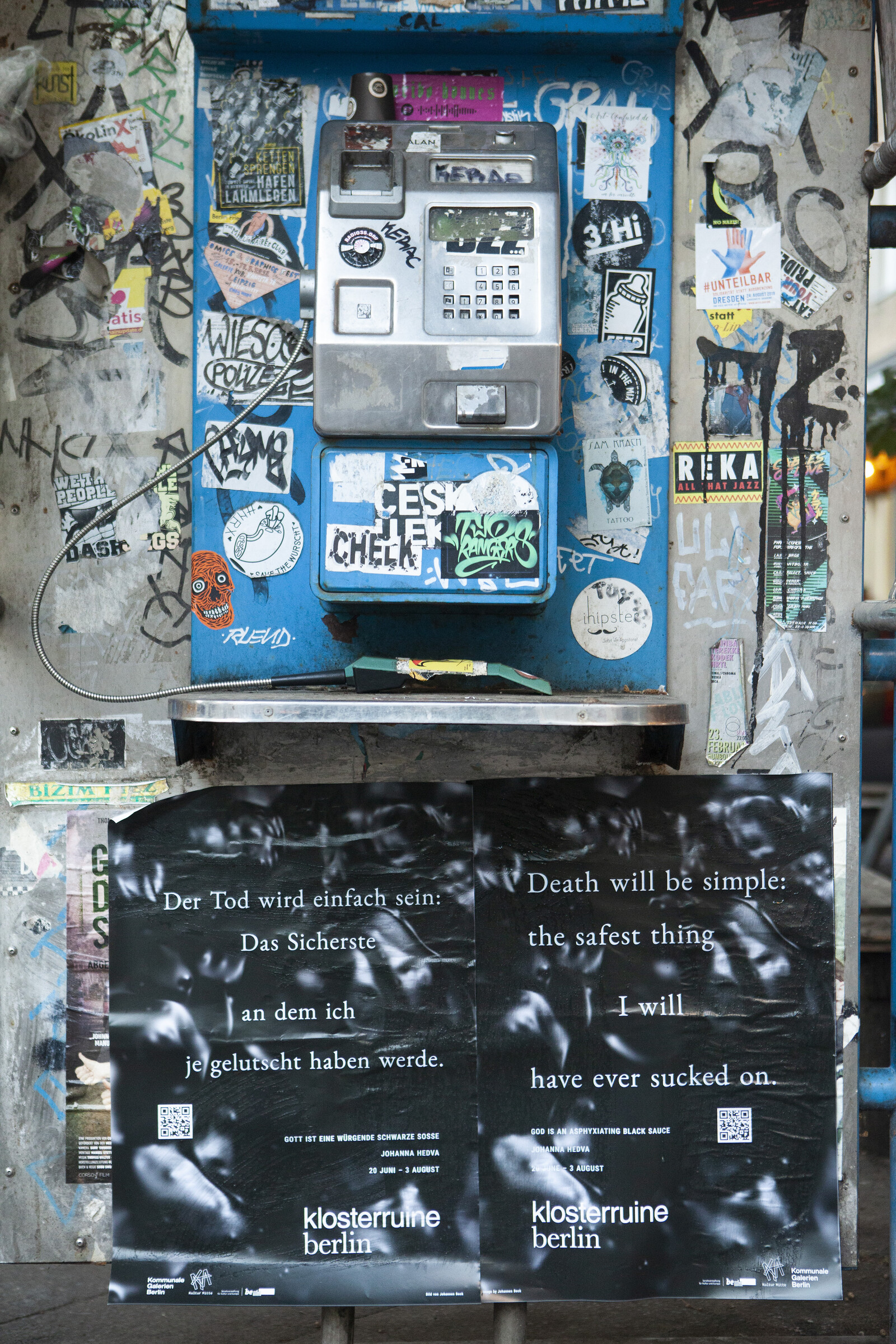In the summer of 2020, Hedva presented their first solo exhibition amidst the rubble of the Klosterruine Berlin. “God Is an Asphyxiating Black Sauce” showcased a decade of texts, songs, and performances, and audio versions of sections from their 2020 book, Minerva the Miscarriage of the Brain.3 The installation was designed to be accessible to all bodies: the Klosterruine was empty aside from red ramps, two speakers, and a series of benches, while the exhibition also took place on the website godsauce.black (with the sound pieces captioned and described) and across the city of Berlin.