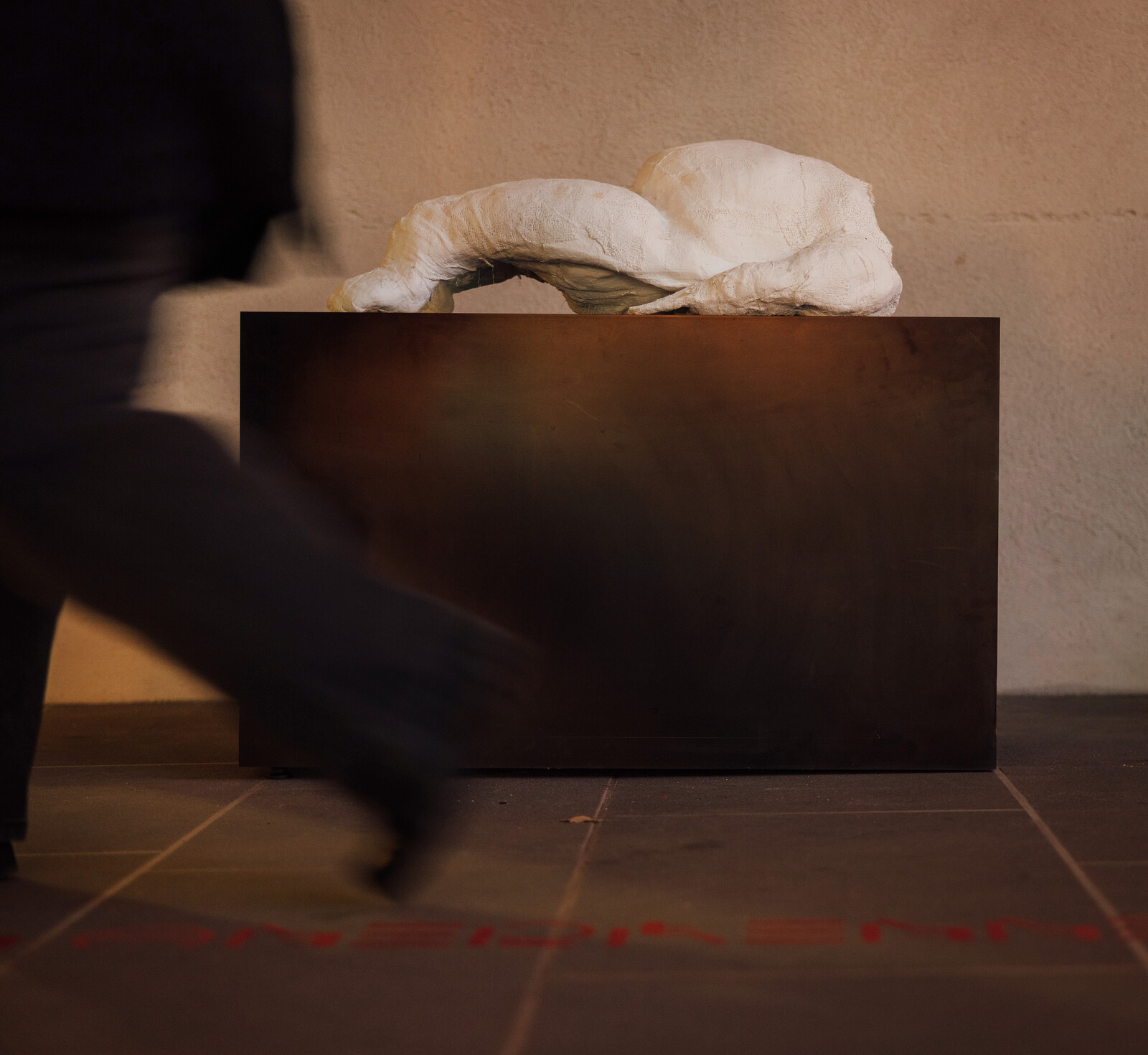 Floor guides provide access for visitors who are blind or have low vision. But in the spacious covered courtyard entrance, it takes time to realize that Beier’s floor guide—consisting of colorful interweavings of commonly used pictograms for woman, man, and wheelchair—surrounds Steven Solbrig’s plaster headless torso disabled women, anonymous (2022), signifying that the sculpture is a part of the exhibition. The floor guide leads from the courtyard to the elevators, and then on the first floor into the Sponsel Room comprising the exhibition’s small main space. It is part of the sequence of many and larger rooms of the Neues Grünes Gewölbe (New Green Vault), which displays Baroque treasures collected by Saxon rulers.