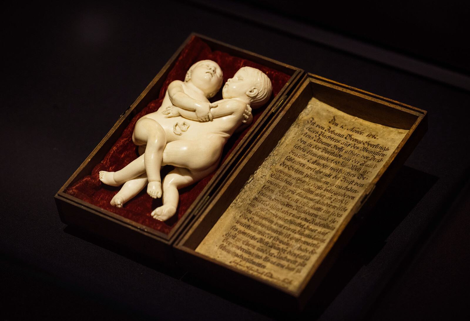 A section of the show titled “Depictions of people” contains sixteenth- and seventeenth-century portraits of Thomas Schweicker and Theodor Steib, “foot artists” who, having no arms, used their feet to write: both are shown writing. A seventeenth-century etching depicts Orazio Gonzales, patriarch of a family from Tenerife. A wall text notes: “The father and several of his children had abnormal hair growth on their faces and all over their bodies.”
