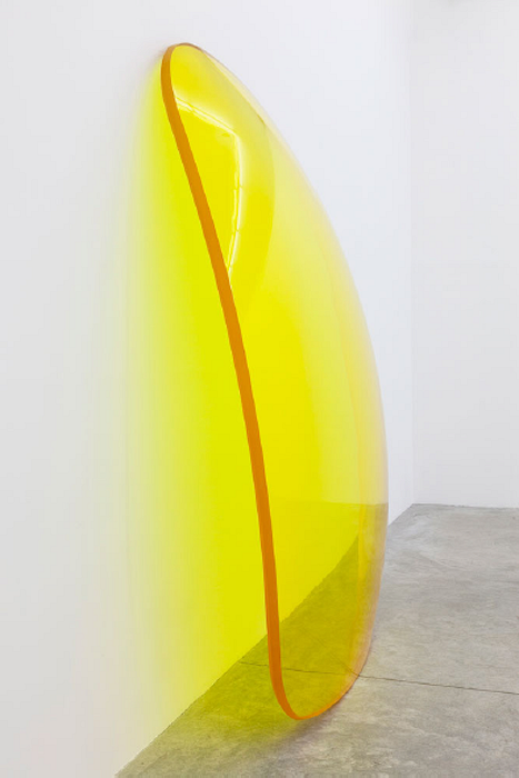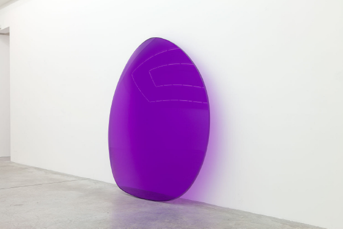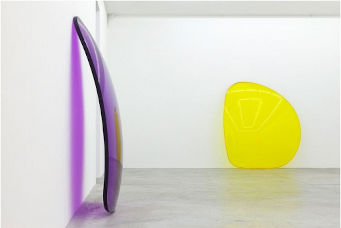 In the gallery’s largest room, three eight-foot-tall sunglass lenses from Israel’s “Lens” series (2013–2015) lean nonchalantly against the walls. Translucent yellow, orange, and purple, these oversized plastic teardrops are unmistakably representational, but recall minimalist works by the Light and Space artists who pioneered the appropriation of industrial plastics for large-scale sculptures in LA in the 1960s. Evoking DeWain Valentine’s candy-colored polyester resin discs (a group of these “Circles” made in 1971 was shown in Paris for the first time at Almine Rech in 2014), Israel’s shiny convex surfaces revive the “fetish finish” aesthetic associated with Valentine and his contemporaries including Larry Bell and John McCracken. Elegantly bowed with beveled edges, the lenses glisten from the front and cast tinted halos onto the white walls behind them. Their sunset spectrum conjures the particularly Southern Californian combination of sun, sea, and smog that inspired the Light and Space artists half a century ago.