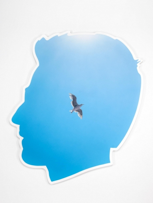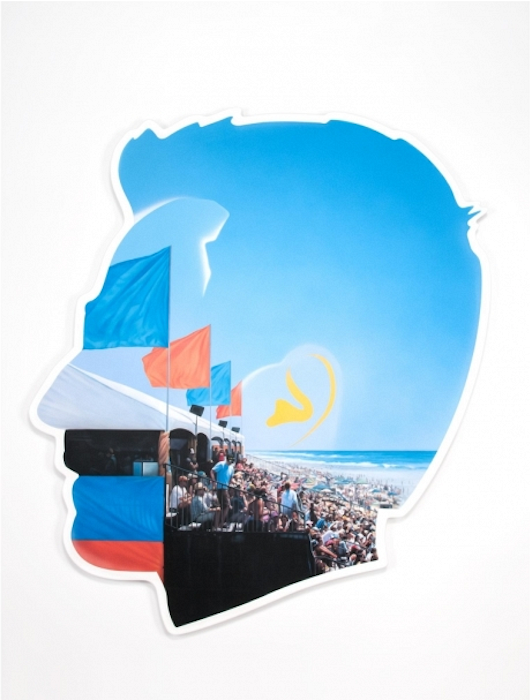 Two large-scale self-portraits painted on fiberglass supports underscore Israel’s unabashed artist-as-brand identification. Originally conceived for the title sequence of “As It Lays” (2012)—a YouTube series in which the artist interviews past-their-prime Hollywood personalities ranging from Molly Ringwald and Melanie Griffith to Kato Kaelin and Vidal Sassoon—Israel’s stylized silhouette has since become the subject of a series of paintings. Self-Portrait (Seagull) and Self-Portrait (U.S. Open of Surfing) (both 2014) each frame an LA beach scene inside the artist’s distinctive sunglass-wearing, spiky-haired profile. Seagull shows a lone bird—positioned approximately where Israel’s ear should be—gliding through a brilliant blue sky. On the opposite wall, U.S. Open of Surfing depicts the annual surf competition at Huntington Beach. Suggesting an updated version of Seurat’s Un dimanche après-midi à l’Île de la Grande Jatte (1884), Israel’s vision of waterside leisure shows fan-packed bleachers overlooking the beach and crashing waves beyond. Having deleted corporate logos from the flags and banners depicted, Israel rebrands the sporting event by superimposing his own physical features onto the landscape. Airbrushed in white, his hairline is almost mistakable for a cloud. His bright yellow ear hovers like a misshapen sun just above the horizon line. Based on Israel’s own photographs, these paintings were made by Warner Bros. set painter Andrew Pike (a collaboration that dates back to 2010, when Israel commissioned several backdrops for the “As It Lays” set). Colorful, crisp, and flat, the paintings’ combination of airbrush and brushwork brings to mind yet another LA artist, Ed Ruscha, whose Hollywood portraits range from the famous hilltop sign to the Twentieth Century Fox logo.