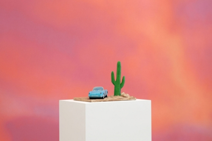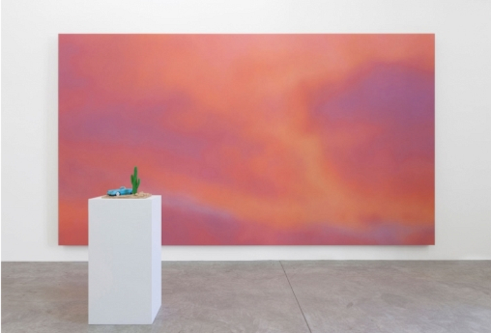 Also painted on the Warner Bros. lot, Sky Backdrop Painting (2014) blends the orange, purple, and yellow hues of Israel’s “Lens” sculptures into a fiery sunset. As its title suggests, this 9 x 16 foot painting serves as cinematic backdrop for Desperado (2015), a small sculpture displayed on a white pedestal. The painted bronze miniature, a turquoise convertible parked next to a cactus, is based on a movie prop Israel found in Rome. After using the prop in an exhibition of “Property” (2010-ongoing), a series in which he presents rented objects as temporary readymades, Israel produced an edition—each of which is painted differently. The car is a 1950s Corvette, but the blue in this version matches the Ford Thunderbird model of the same era. With no driver or steering wheel in the car, this ghostly vignette foreshadows “The End” on various levels. Illustrating a cliché Hollywood ending—riding off into the desert sunset—the work specifically recalls the freeze frame finale of Ridley Scott’s 1991 film Thelma and Louise in which the fugitives’ car (a blue 1966 Thunderbird convertible) hurtles into the Grand Canyon. Evoking cinematic endings generic and specific, this tableau also bids farewell to a dying Hollywood art. As hand-painted movie backdrops become obsolete, replaced by high-resolution digital photographs and computer-generated imagery, Israel reincarnates this outmoded trade as part of his fine art practice.