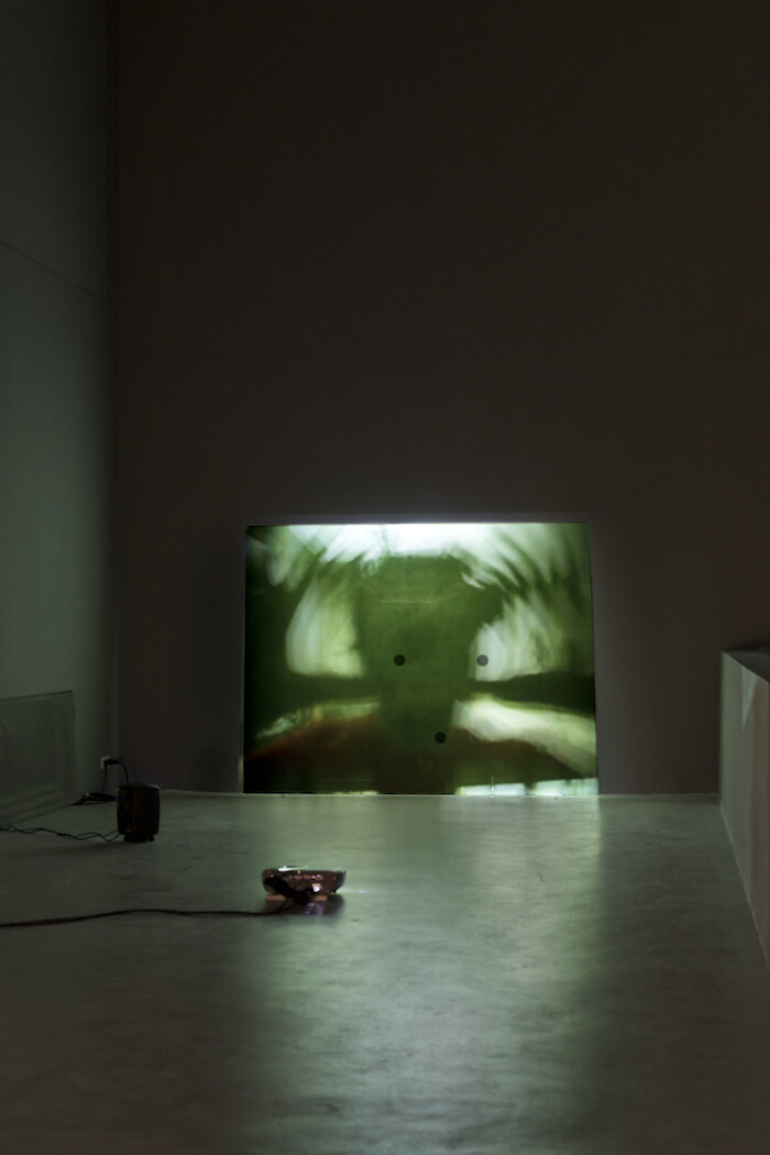 Though mute, the work of Gusmão and Paiva is far from silent. The chatter of eleven 16mm projectors textures the ambience, calling attention to their own analogue properties and to the traditions of movie making both challenged and championed by the artists. By contrast, many of Estrela’s contributions are conceptually dependent upon sonic elements. Longing for Darkness (2014) has a Fluxus-style score, performed in coordination with footage of a miniature archaeological model. O Cobra Verde [The Green Cobra] (2009) features inhuman moans derived from a recording of a newborn’s cry. But the transducer-inspired Flauta [Flute] (2010) is the most bizarre: a vibrating bamboo rod produces a concussive whir, which emanates from a hollow in its side. The illusion is achieved by synchronizing sound to anaglyphic visual oscillations. It is enhanced by the artist’s distressing decision to align the hollow with a physical hole in the panel onto which the film is projected. Void onto a void, the result is a trembling orifice emanating meontological feedback.