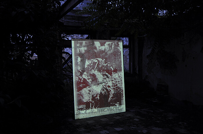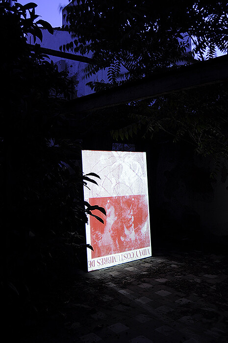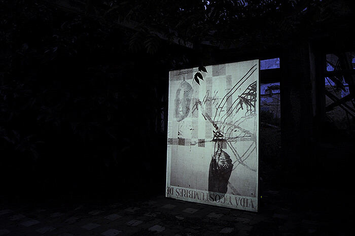 His new work, Vida y Costumbres de Alexander (2015) exemplifies the above-mentioned tension at play. A vertical glass screen leans against an outdoor wooden structure placed inside the ruins of a small, semi-derelict, roofless house on a patio behind the gallery. The surrounding space is mostly revealed by the light of this nocturnal piece, activated by a video projection in the dark. On the right side of the screen stands a large loquat tree, which is barely perceptible yet strangely menacing directly next to the structure. The bright light of the projection hits the screen frontally, obfuscating the viewer, who must move to the side of the glass in order to see the images that are being projected. The slightly tilted glass screen acts both as a transparent and reflective surface, mirroring a white trapeze onto the floor in an expanding geometry of light.