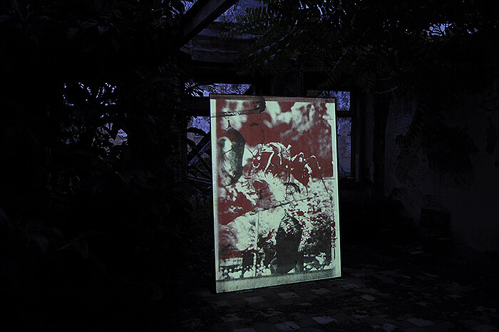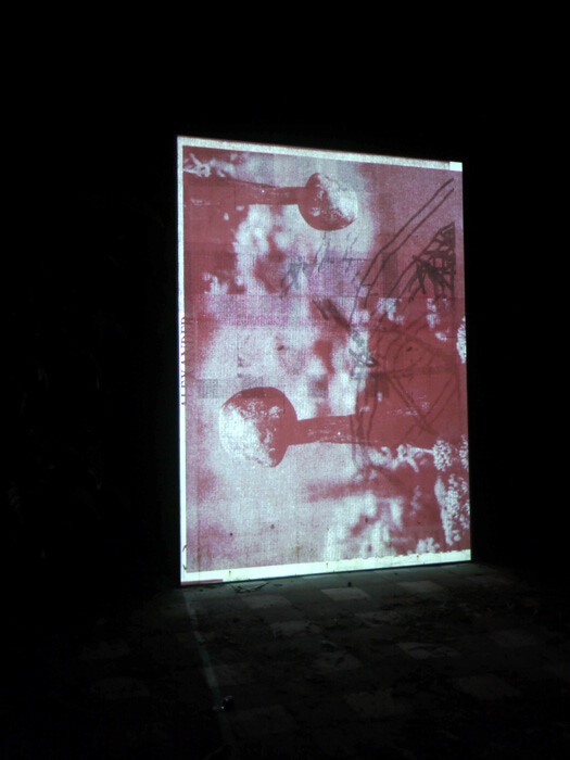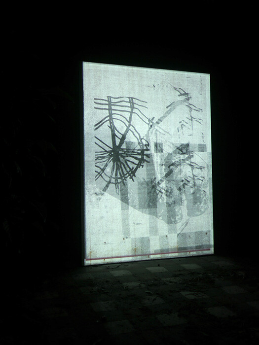 The light of the object-screen allows us to discover the space, while the sound provides an aural density heightened by the imponderable intervention of the wind and the rustling tree. The images and sounds become arrested in their own artifice within an endless extended and perpetual slow mutation which mirrors their own subjectivity—nature mutating within nature, nature transformed, not-yet formed things. Time, images, the music, and the natural elements of the space shift slowly in repeating cycles.