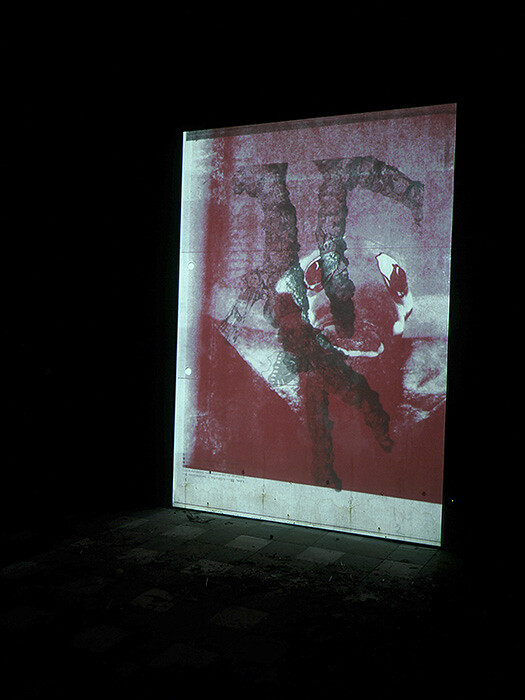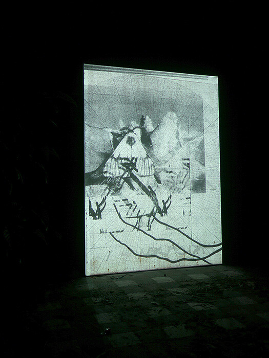 The video juxtaposes enlarged photocopied images combining multiple layers of prints. Images such as the ones taken from an entomology book on the life and habits of Lepidoptera blend with architectural drawings and sketches, with reproductions of Derek Jarman’s sculptures, and with the artist’s own children’s early drawings of a spider web, magnified in dark, large, and abstract lines sprawling across the screen. These still superimposed images are animated through slow dissolves, transitioning from one to the other and forming a continuous sequence repeated on a loop. Each dissolve creates even more layers of imagery, somewhat disturbing our understanding even further. A densely textural electronic music (an early 1970s feedback work of the French composer Éliane Radigue), emitted by an invisible source, fills the outdoor space in long, sustained cycles. Some of the images are reproduced as serigraphs at the entrance of the gallery.