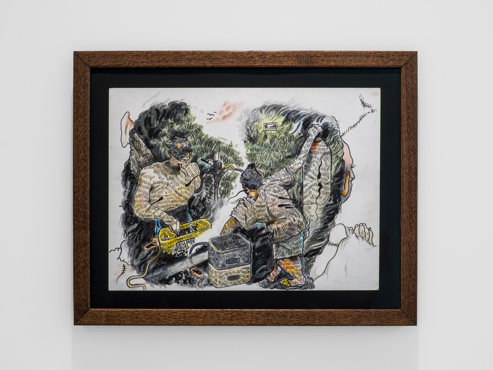 “In the Head’s Sunrise”, a quiet yet compelling exhibition of Ali Eyal’s recent drawings and paintings, captures the intricacy and complexity of the young Iraqi artist’s practice; the emotional texture of the work, accomplished through rapid, forceful strokes, is immediately striking. Individually and collectively the works recreate moments from life in Eyal’s hometown—referred to only as small farm—where he came of age amidst the violent turmoil of the US-led invasion of Iraq. The titles of the pieces underscore Eyal’s propensity for narrative along with his acute awareness of its limitations; each enigmatic label ends with “and,” indicating its incompleteness, and suggesting that every encounter is a beginning, like tugging on a loose, seemingly extraneous thread that unexpectedly unravels the entire fabric.