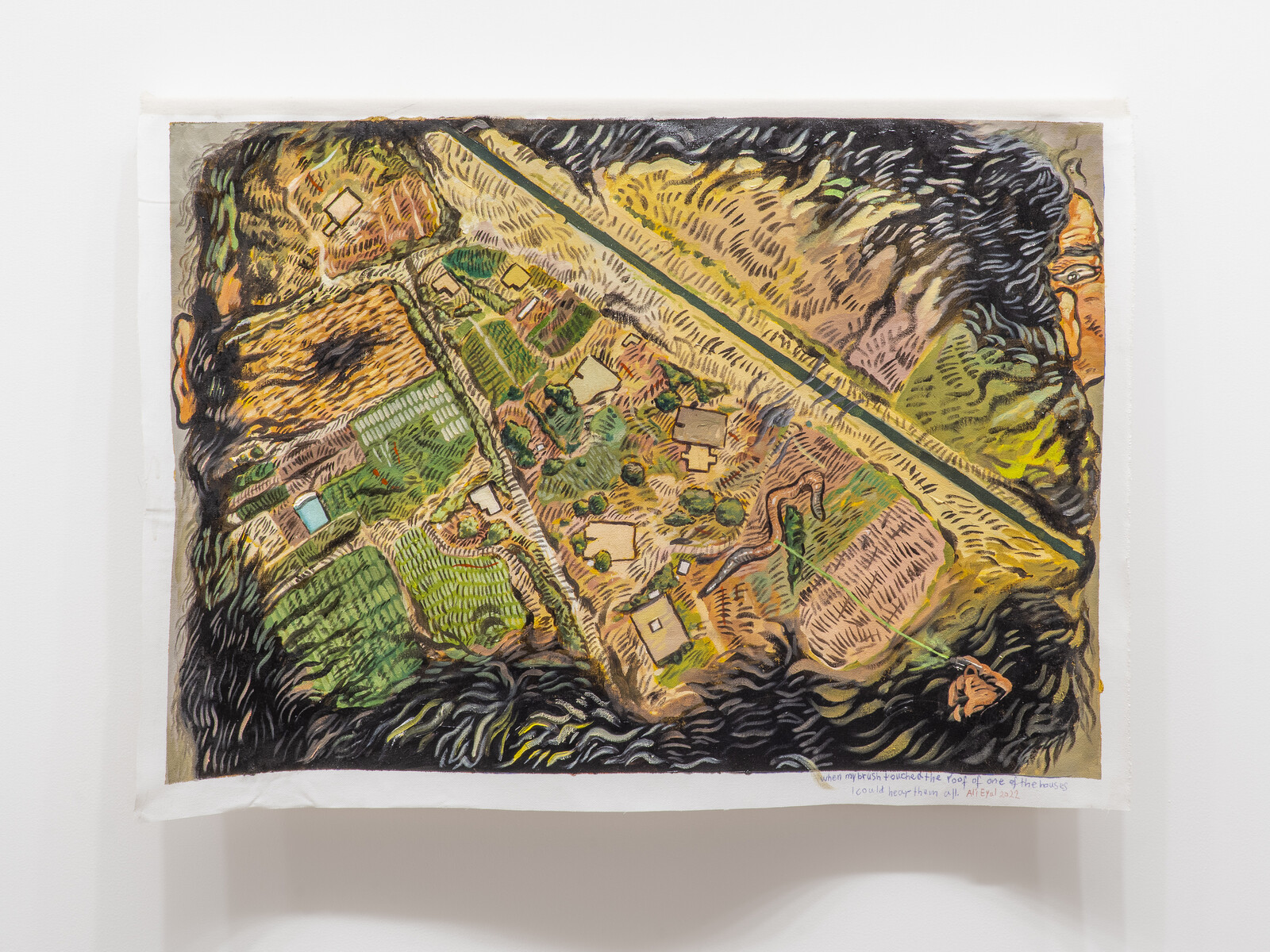 Three heads walking between towns, and (2022) is the immediate focal point of the exhibition and reflects the mythological nature of Eyal’s work. The large canvas hangs like a banner, hands snatching at its sides, attempting to tear through the composition. Three women’s heads attached to makeshift bodies, an assemblage of ill-fitting and dislocated ligaments, dominate the canvas. They are reminiscent of the three fates, their thick black hair unfurling behind them like billows of smoke, each home to a nightscape filled with hidden scenes. Beams of light streaming from flashlights and headlights—which appear and reappear throughout the artist’s work—momentarily cut through the darkness as characters rummage through the foliage in search of some unknown missing object or person. The details hidden in the crevices reveal a world disrupted, at risk of disappearing as bodies merge into a fractured landscape. In New update, and (2022) the distinction between characters and their surroundings is more uncertain. The world that Eyal creates is haunted by the absent and disappeared: “When my brush touched the roof of one of the houses, I could hear them all.”