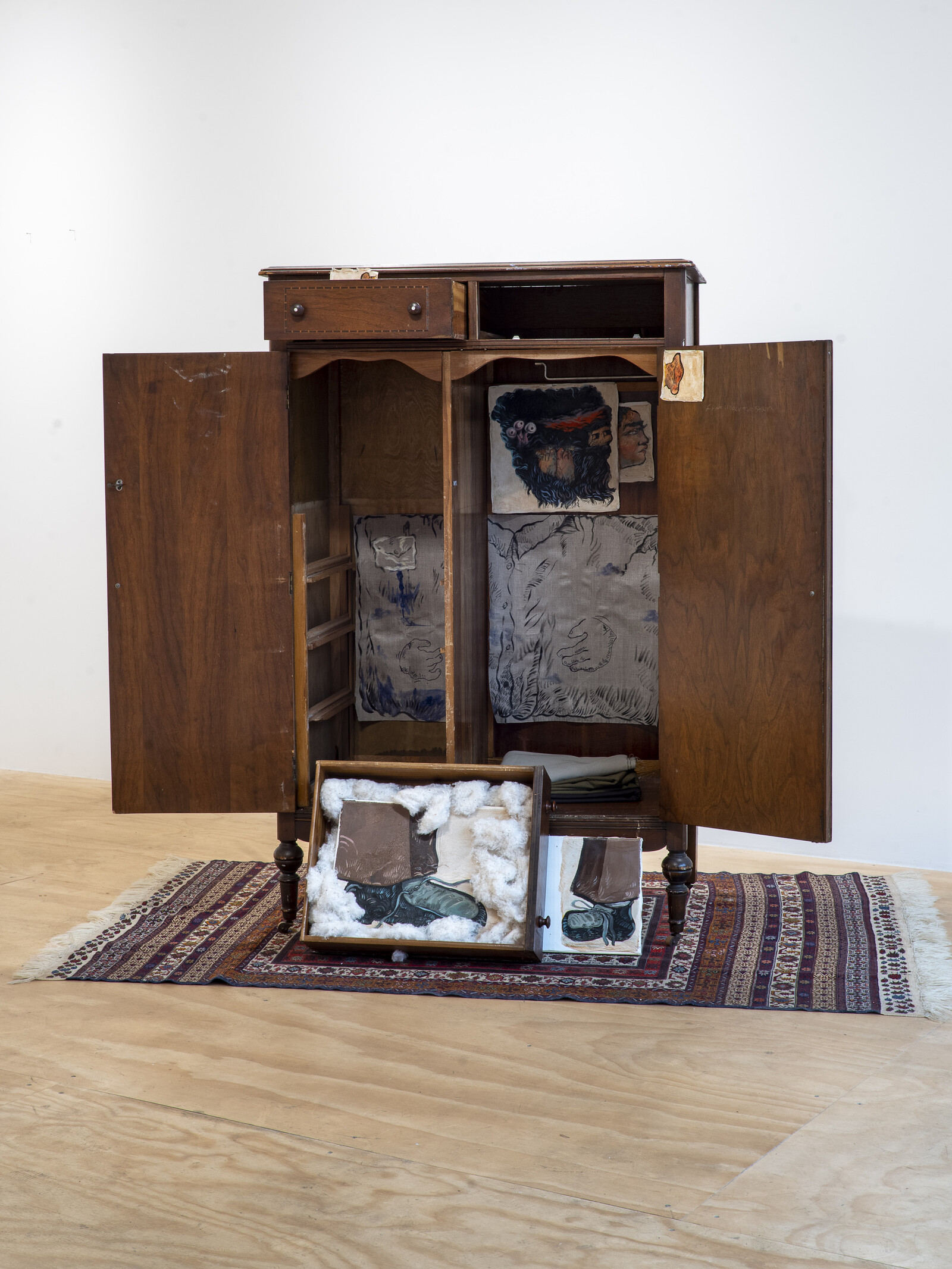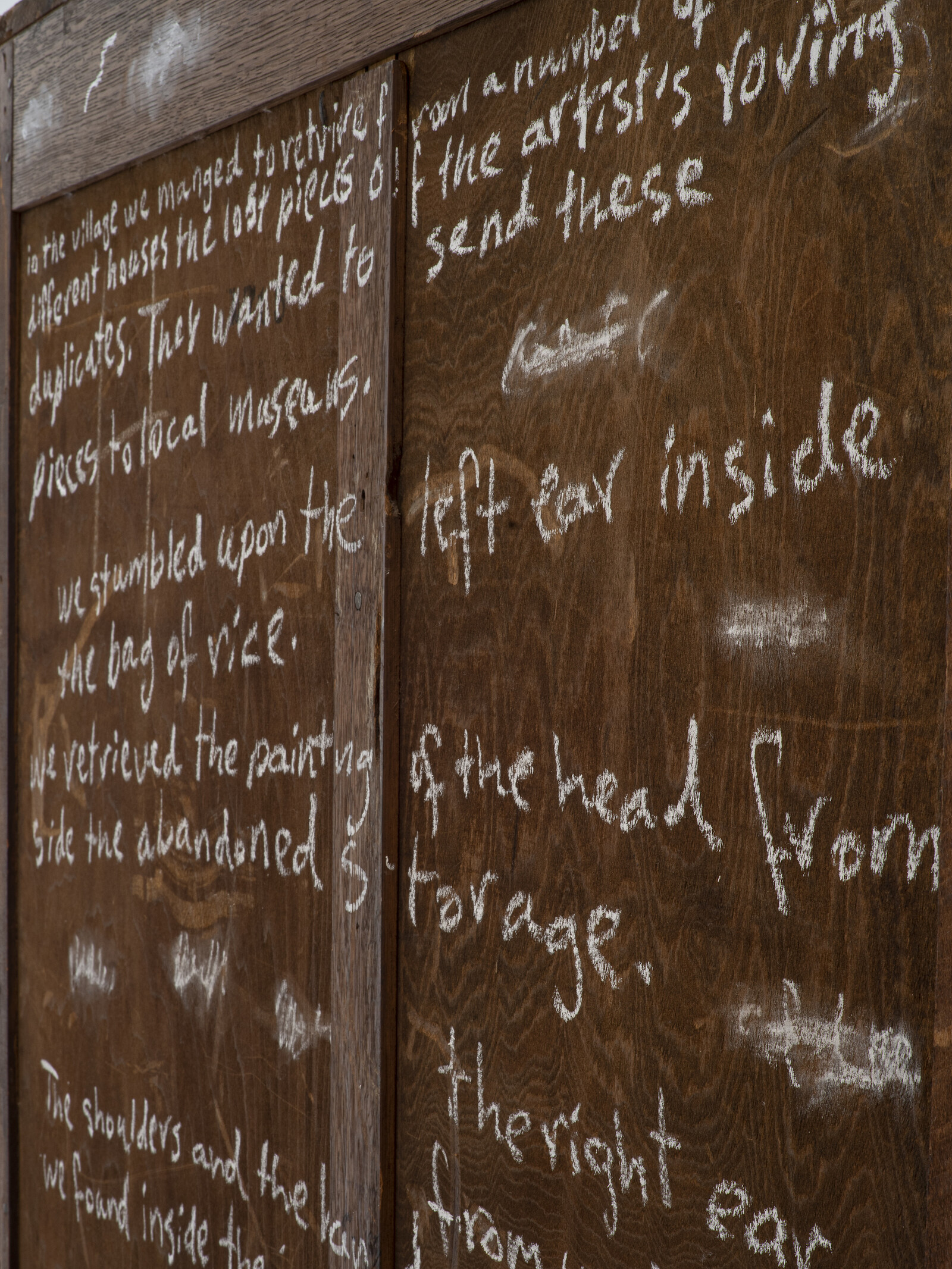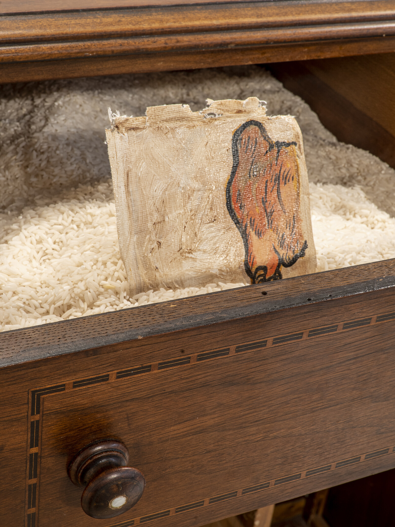 Eyal weaves together stories from elusive fragments and shards—memories, dreams, nightmares—assembling them in a disfigured whole which becomes a commentary on both the urgency and the impossibility of (coherent) narrative in the face of ongoing chaos and destruction. A heavy wooden wardrobe sits on a woven carpet in the middle of the gallery space, its doors gaping, its drawers spilling out, its innards bursting in silent horror. In The blue ink pocket, and (2022) a self-portrait, once intended to travel internationally in the artist’s place—Eyal identifies painting as the mode best suited to the immigrant artist’s life, being able to transverse borders with relative ease—is now maimed and scattered throughout the wardrobe: an ear in a drawer full of rice, a foot stuffed amongst the cotton in another. Scrawling on the back of the wardrobe in chalk, Eyal describes the process of retrieving these dispersed pieces. Like Frankenstein’s monster, even if recovered, these parts can never be stitched together to reconstruct the artist, whole and functional.