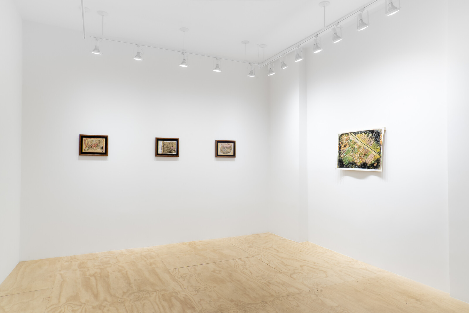 In a wall text, Eyal explains how “courtroom drawings,” quickly executed, are for him “a double tool of witness” in which “sometimes the outlines connect and sometimes they do not.” In a series of three 2020 pencil, ink, and gouache drawings—each titled Berlin’s drawing pad, and—body parts enframe the scene while also unfolding within it; long legs straddle the stage, hands cup vignettes. Once again, the indistinguishability of the frame and the image disrupts any potential linear narrative, instead turning it inside out.