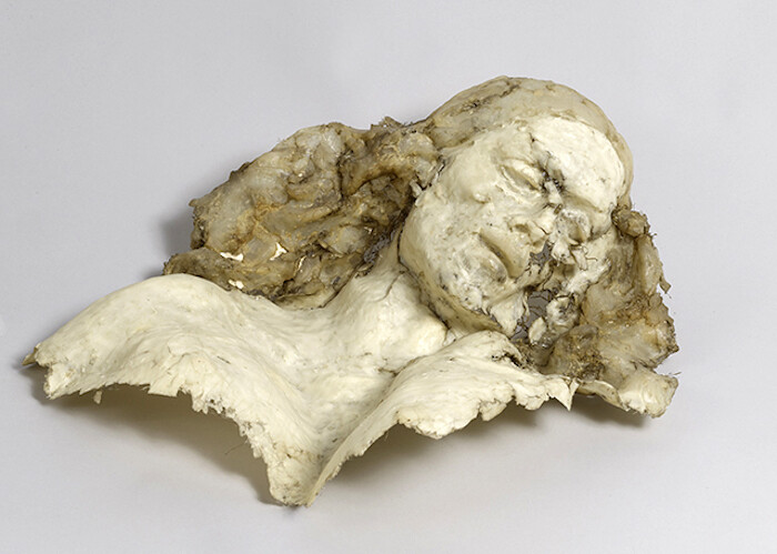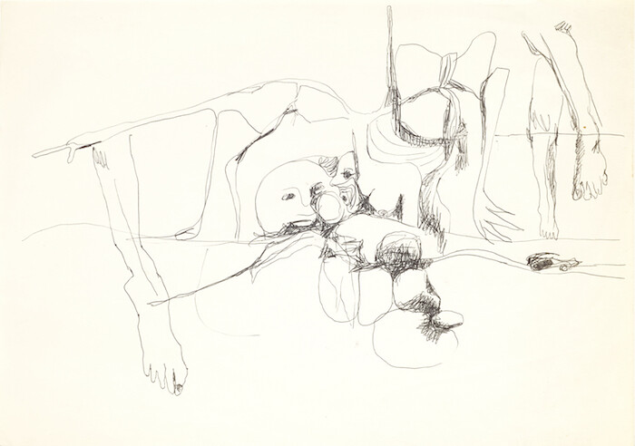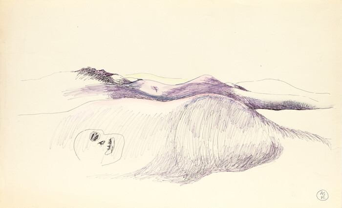 It is impossible not to associate these drawings of fragmented bodies and ghostly translucent figures with the atrocities that Szapocznikow witnessed while interned in Auschwitz, Bergen-Belsen, and Theresienstadt. Like most of her work, however, the “Human landscapes” are full of personal anguish as opposed to political aggression. Recalling the autobiographically sensual “body awareness paintings” of Maria Lassnig (another postwar artist who pushed the limits of figuration), Szapocznikow’s discombobulated figures describe an internal struggle. Having survived the Holocaust, the artist suffered from tuberculosis before eventually succumbing to cancer. Nowhere is the allusion to death more imminent and intimate than in a 1971 Human landscape featuring a purple-tinged female figure lying face-down in a landscape of gently rolling hills under which a skull lies buried. The contours of the woman’s outstretched arms, concave back, rounded buttocks, and slim legs echo the undulating ground beneath her. A hint of yellow at the horizon suggests a desert sun under which the lifeless body appears to be melting into the ground. Body and earth are in such close harmony here that they almost blur into one. With Szapocznikow’s ethereal interpretation of the figure-ground relationship we feel the artist coming to terms with her own mortality.