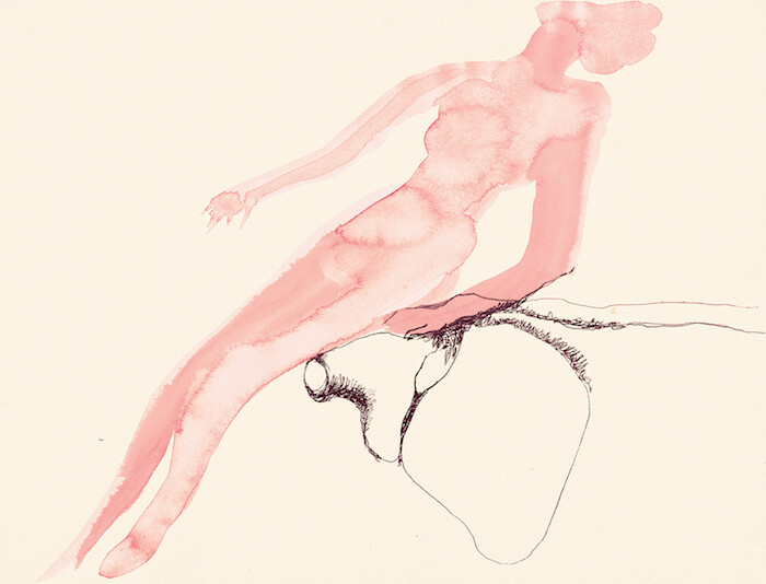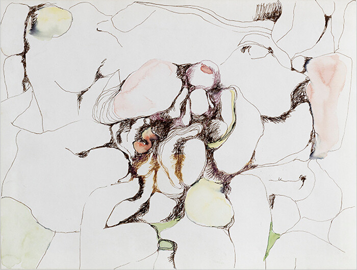 Verging on abstraction, the bodies and body parts delicately represented in pen, ink, and watercolor commingle with their environments in morbidly erotic ways. In Human landscape III (1972) a rugged outcrop outlined in black felt-tip pen contains a mishmash of biomorphic fragments and geological forms. Jumbled together towards the center of the composition, a pale pink torso lies next to a hair-lined orifice, an indeterminate red organ (intestines or perhaps lungs), and a pair of elongated foot-like appendages. Towards the top of the pile, a small pink oblate form resembles plump lips on an otherwise featureless and colorless head. Interspersed around this discombobulated and eviscerated figure, greenish daubs and yellowy washes evoke mossy rocks and muddy streams. The intimate relationship between human and nature is clear, but whether this particular body is being absorbed by the landscape or emerging from it remains ambiguous.
