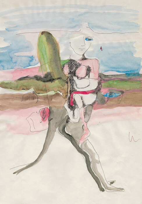 Elsewhere, body parts fused (and confused) with the landscape evoke a relationship between humans and the earth that is simultaneously grotesque and sublime. In Human landscape (ca. 1971–72), Szapocznikow forgoes pen outlines and paints two pink bodies hovering in a balletic embrace. The headless couple floats upwards, leaving behind a thin yellowy-green horizon line. Implicitly heaven bound, the merged bodies suggest a polymorphous angel. Another Human landscape (also ca. 1971–72) imagines an erotic interlude between a woman and a phallic rock formation. Leaning back, the pink female figure arches her back in ecstasy while caressing the craggy erection beneath her.