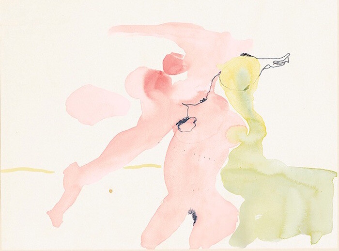 Szapocznikow’s use of color in this series—a rarity in her drawings—adds a surrealist dreaminess to her signature “disarticulation of form.”1 A sparingly applied, limited palette of pinks, greens, yellows, and browns underscores the simultaneous frailty and vigor of Szapocznikow’s fragmented subjects. Watery pink figures are at once translucent and ghostly as well as flushed and vibrant. Washes, sometimes layered, of browns, greens, and yellows, meanwhile, create chromatic links and overlaps between the environment and its inhabitants. As flesh bleeds into landscape and earth washes over the body, the distinction between figure and ground becomes unsettlingly blurry.