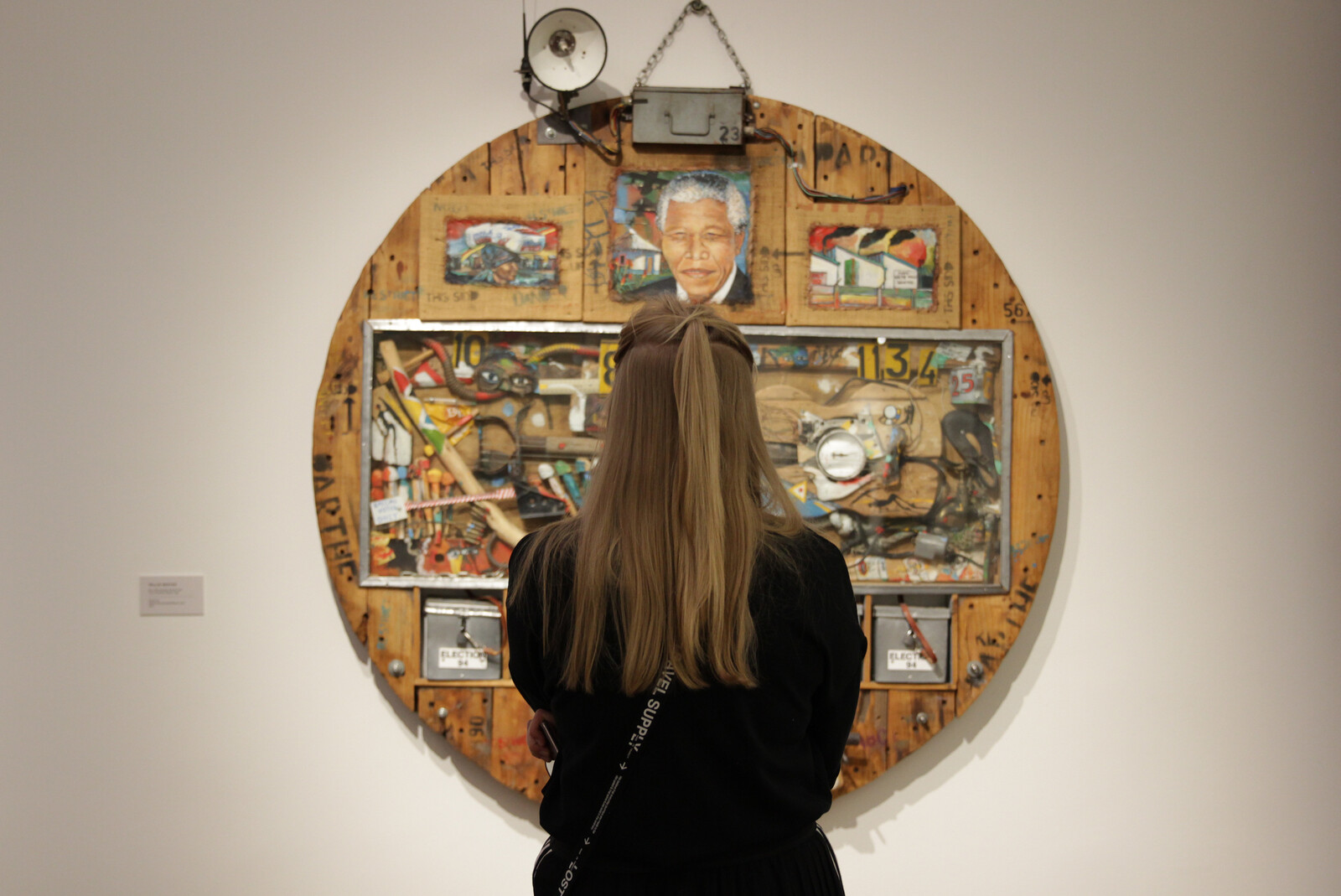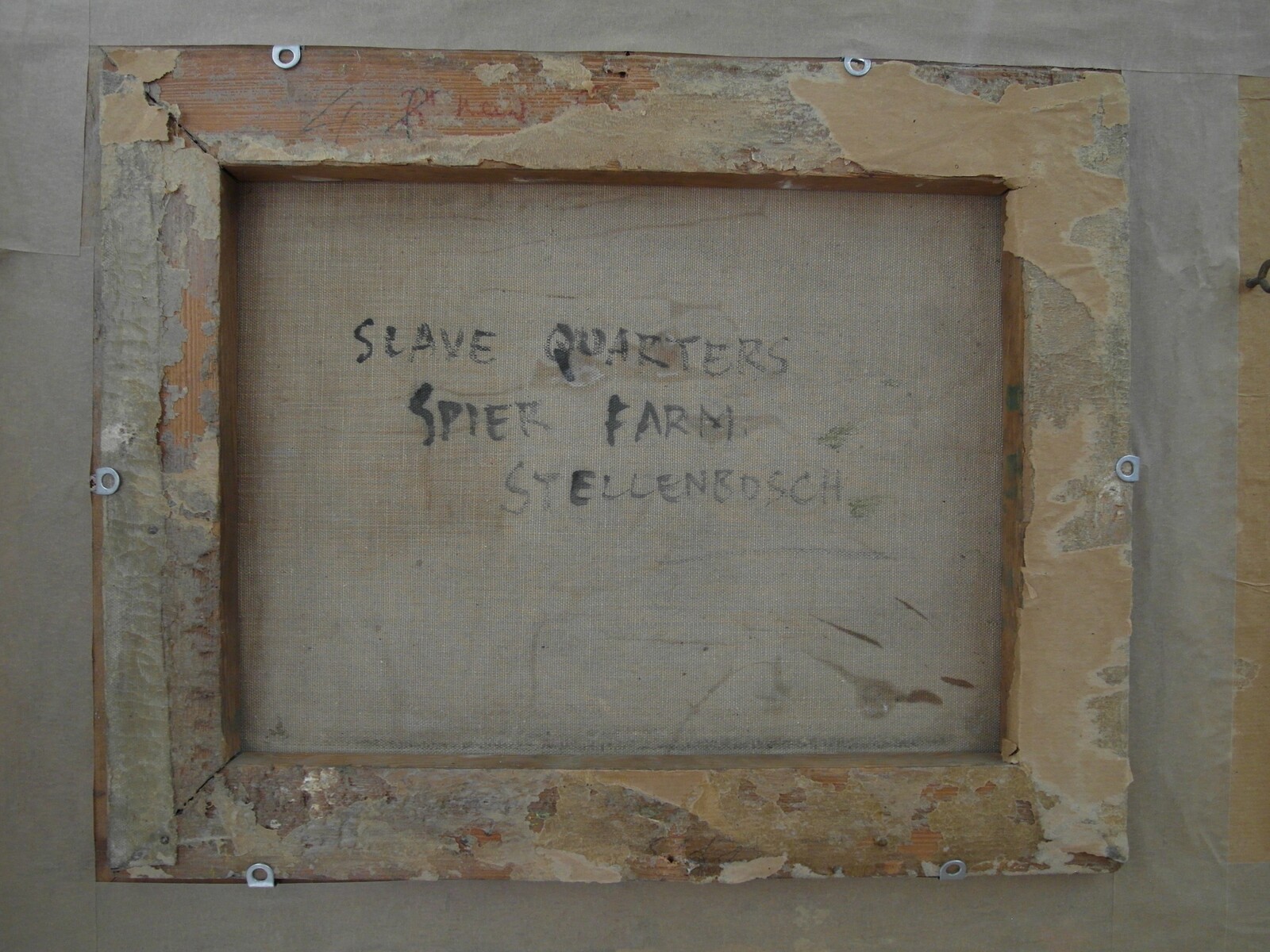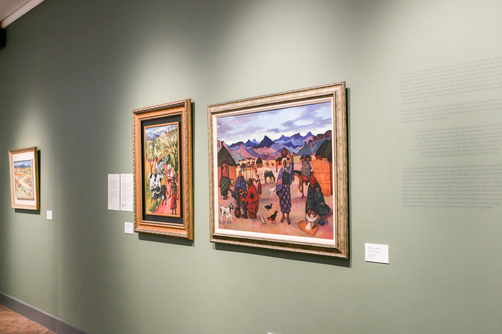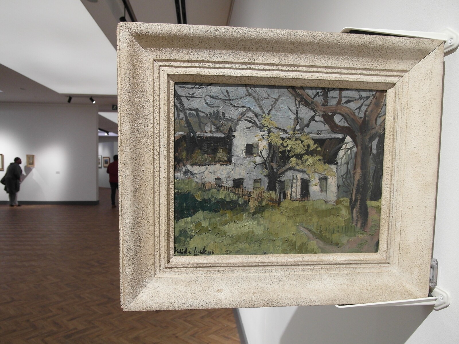 Installed opposite Roworth’s work at the entrance is another Cape genre painting: Freida Lock’s 1946 architectural study of a gabled Cape-Dutch building on a wine farm. The Jonkershuis, as it is known, was built in 1817 and used to house slaves. This fact was elided from the work’s received title, A Cape Dutch Homestead, even though the artist explicitly titled it, in large letters on the back, Slave Quarters, Spier Farm, Stellenbosch. Lock’s Post-Impressionist study is obliquely mounted so that this detail is made visible, which is not a new tactic in South Africa, but nonetheless a necessary one in a context where auction houses often parrot unreformed histories of white achievement. The accompanying wall text, written by Buhlungu, does not clarify the reason for the elision, only stating that the relabeling is “historically misleading” and initiated the “erasure of an unavoidable [sic] violent past”—the interpretive texts often rely on affect, rather than dispassionate scholarship, to argue a point.