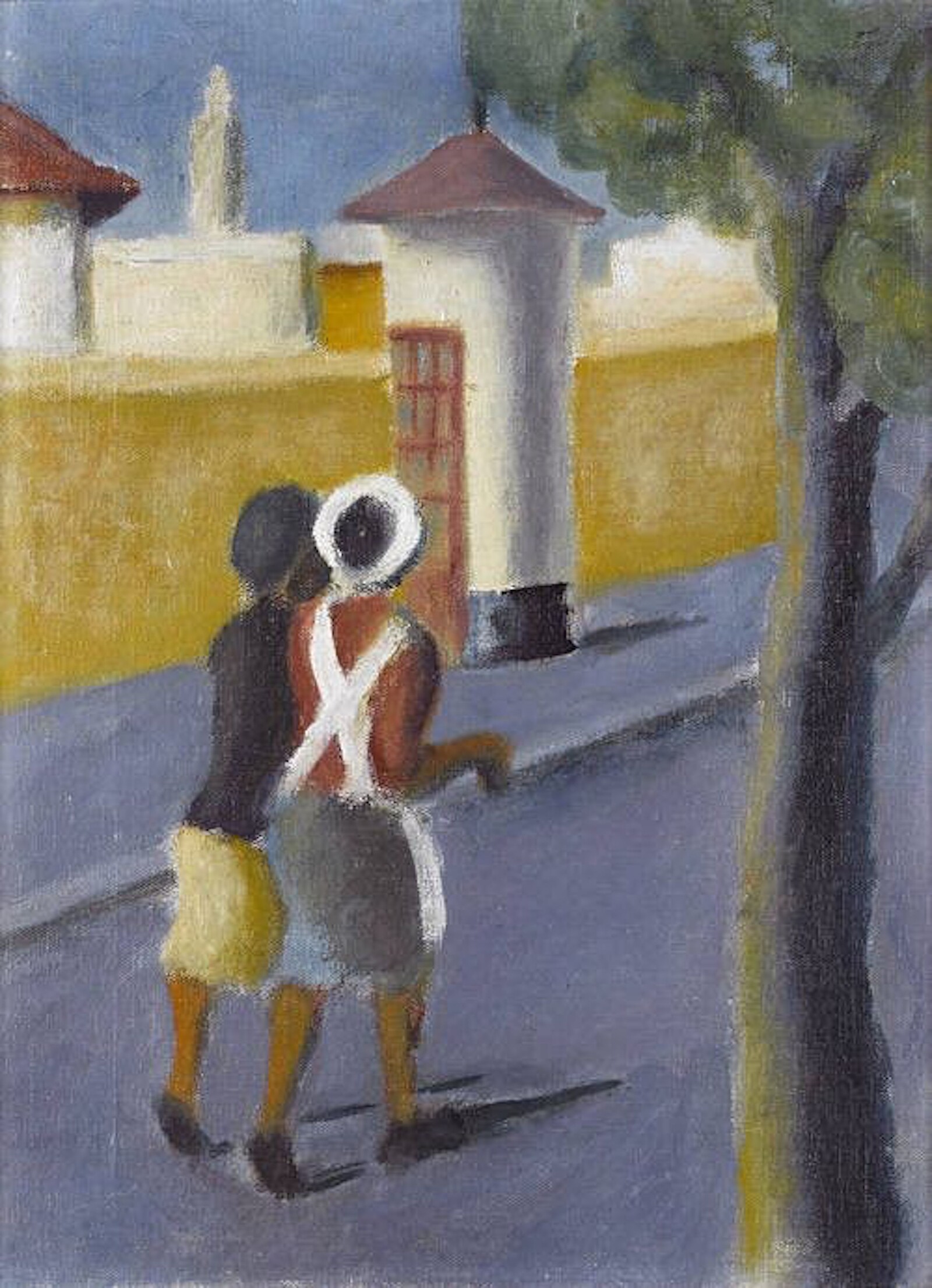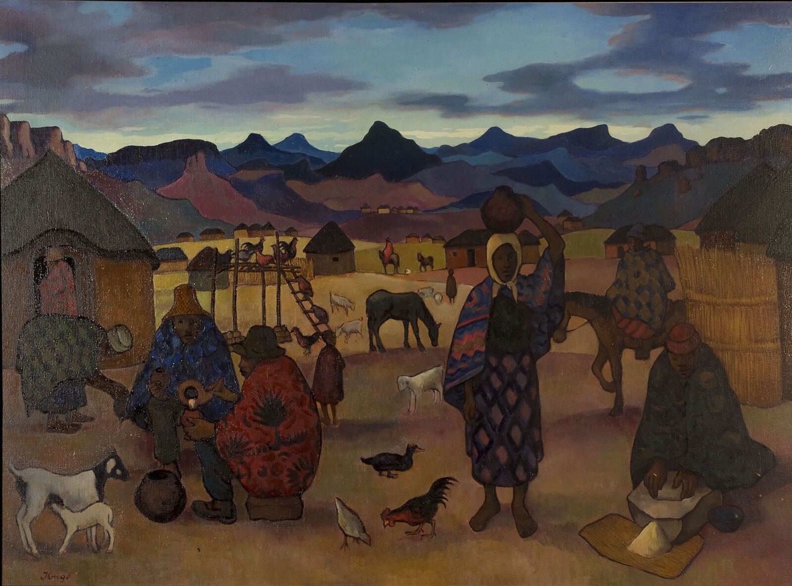 The show opens with a hoary genre painting by English-born Ivanonia Roworth, The Return from School, Genadendal (1954). This Barbizon-style work depicts two groups of children outside three thatched buildings, one topped with wispy smoke, in a community that was once a refuge for freed slaves; Genadendal, located at the foot of a mountain range near Cape Town, is also the site of the oldest mission station in South Africa, as well as the country’s first teachers’ training college. The date of the painting is significant: it follows the enactment of the Bantu Education Act of 1953, a key piece of apartheid legislation that shuttered mission schools through the creation of a centralized, white-controlled state body for black education. Protests ensued between 1954 and ’55, although this agitation, as the wall text makes clear, is absent from Roworth’s saccharine idyll of rural simplicity.