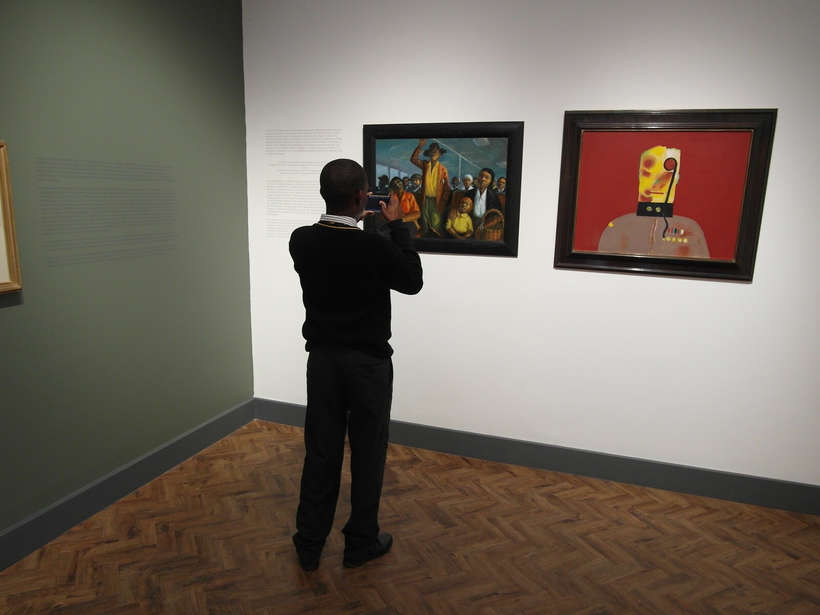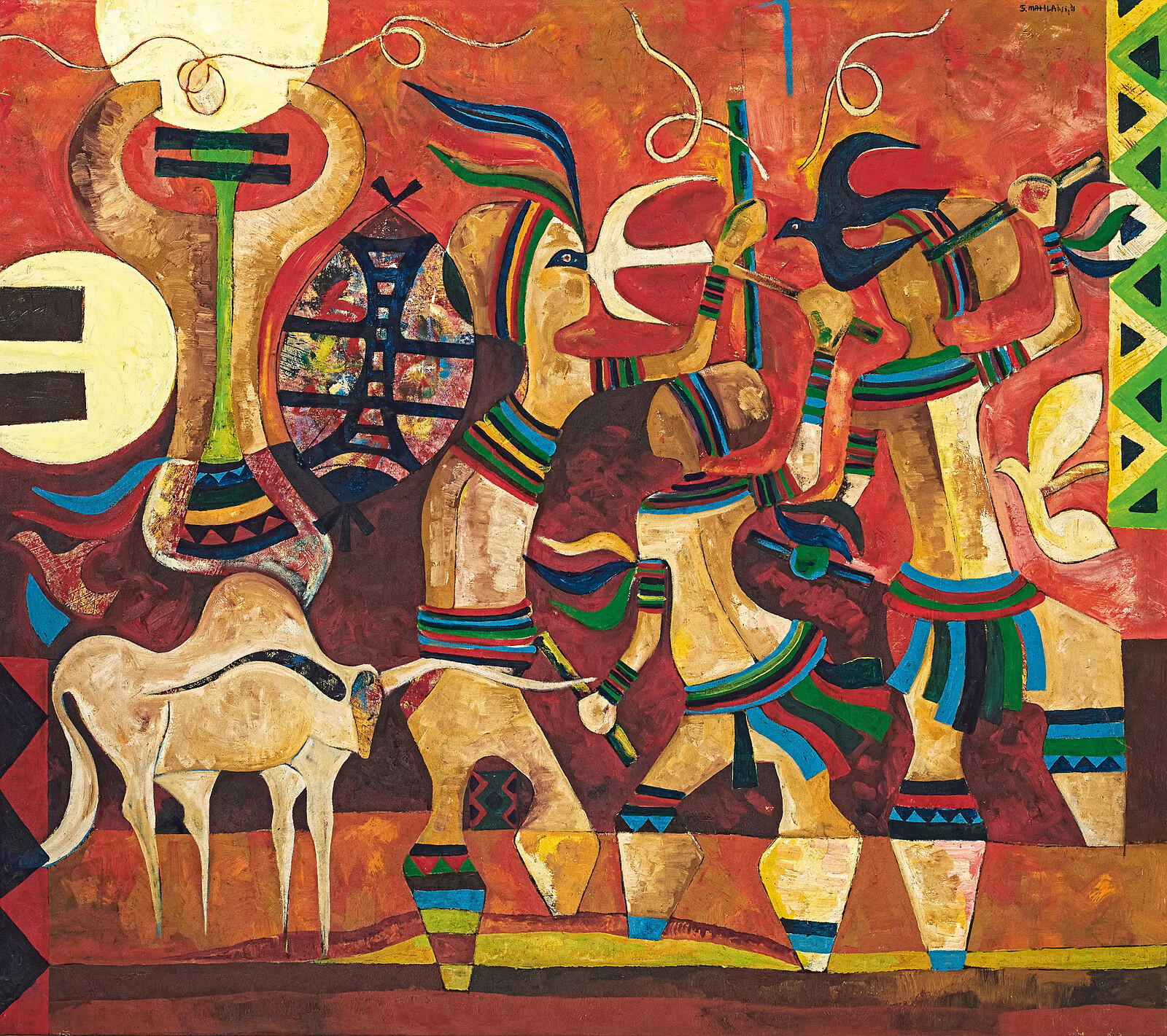 Titles, adds Buhlungu in the wall text, “provide interesting insights on the larger socio-political, historical, and cultural climate” of a work. This analysis informs many of the thematically organized selections, including a grouping of four portraits of black women wearing head wraps by Emily Fern, Gladys Mgudlandlu, and Gerard Sekoto. Both Fern and Mgudlandlu depict women of Xhosa heritage; Fern’s undated work, A Pondo Muse, makes some concession to this fact, but Mgudlandlu’s expressionist portrait from 1963 is merely titled African woman smoking a pipe. What does it mean to label an obviously black subject “African” in Africa? Buhlungu asks. And what of the complicity of black artists in this labeling?