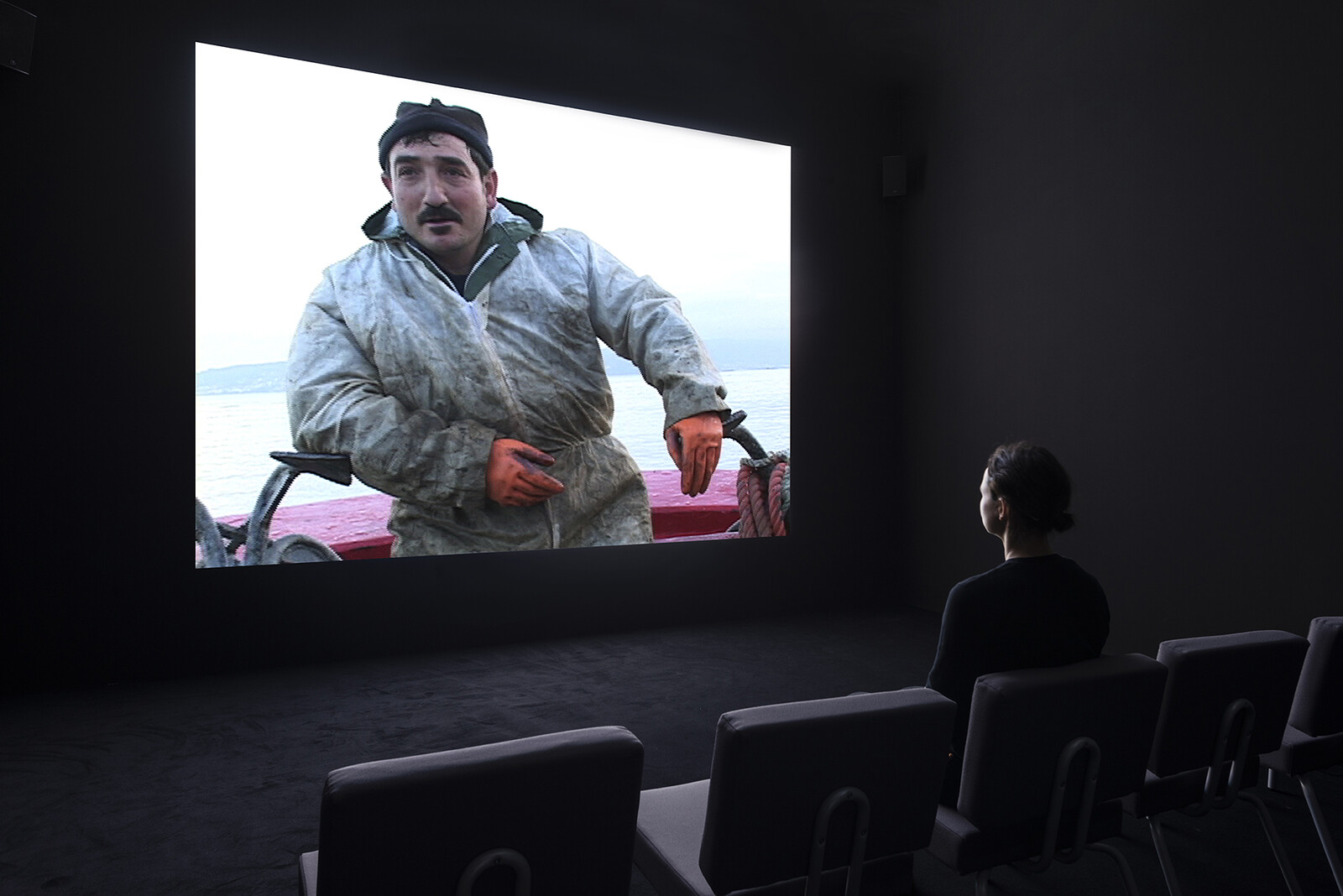In one gruelingly unedited scene of Allan Sekula’s three-hour film essay Lottery of the Sea (2006), a figure suited head-to-toe in white Tyvek hauls a gluey black lump across a slate-gray jetty. Steely waves wash up pebbles of oil, which she collects by rolling or smashing the lump upon them. Her mass will soon be lobbed into a rubber basket, foisted up a dune by a chain of hands, and deposited in a sea of oily baskets awaiting removal. The labor of viewing this protracted sequence faintly echoes its subject: the Sisyphean task of cleaning an oil spill on Spain’s Galician coast, accomplished by volunteers and by hand. In a world where most things are—as Sekula says of a Greek fish market at the film’s start—“fresh but dead,” the scene’s weary, weather-worn figures testify to the fragile solitaries born in struggles to resist the wholesale extermination of human and non-human life.