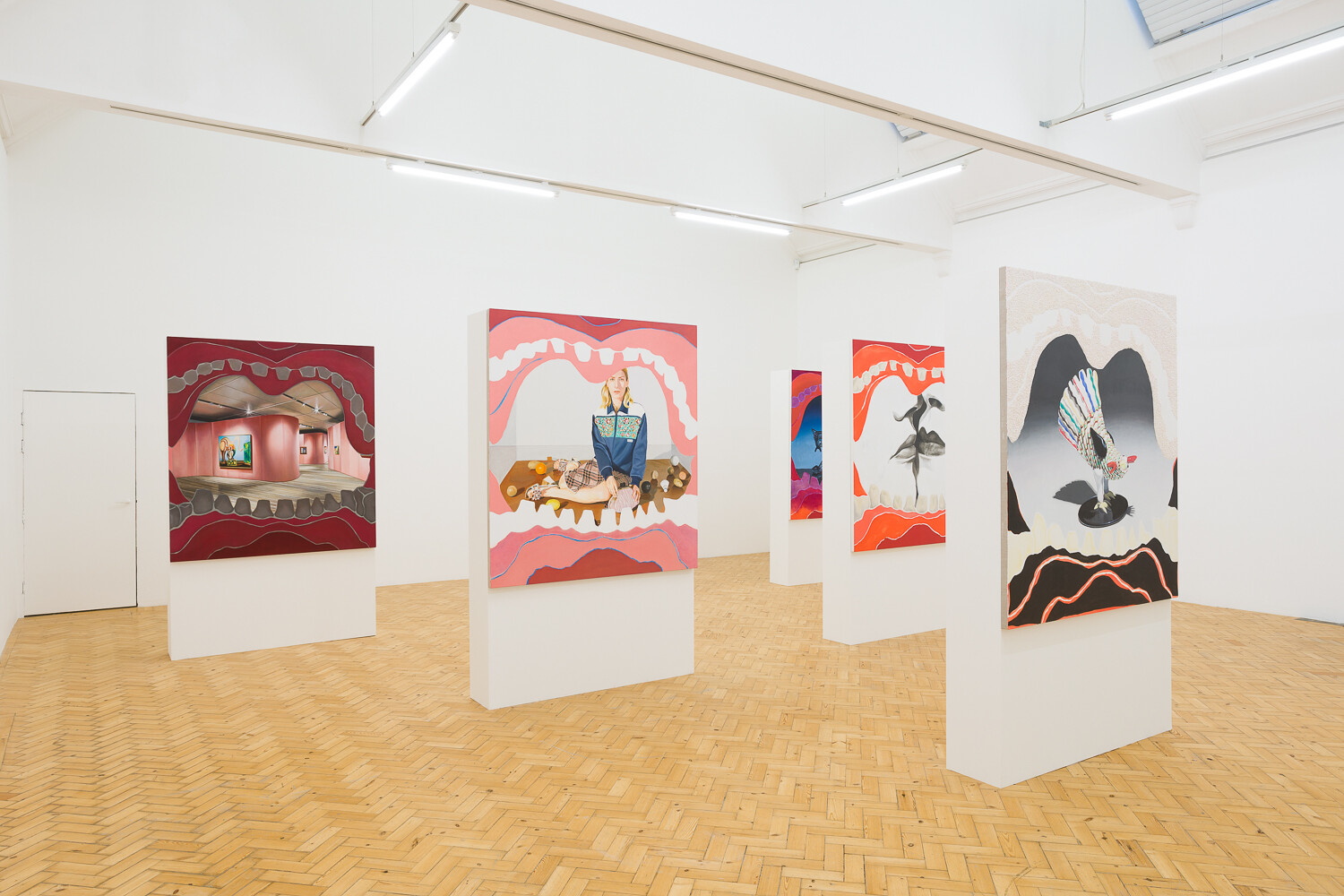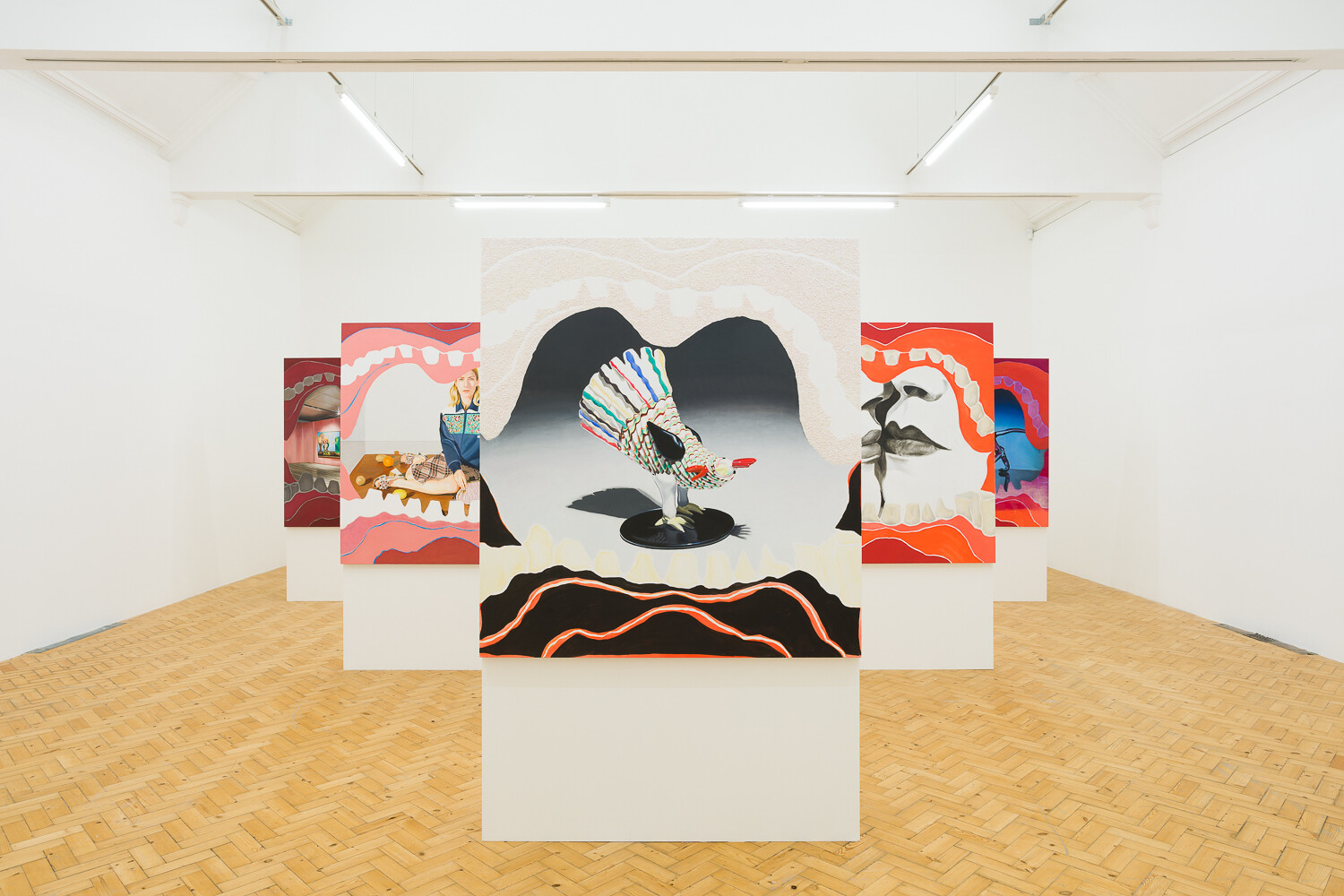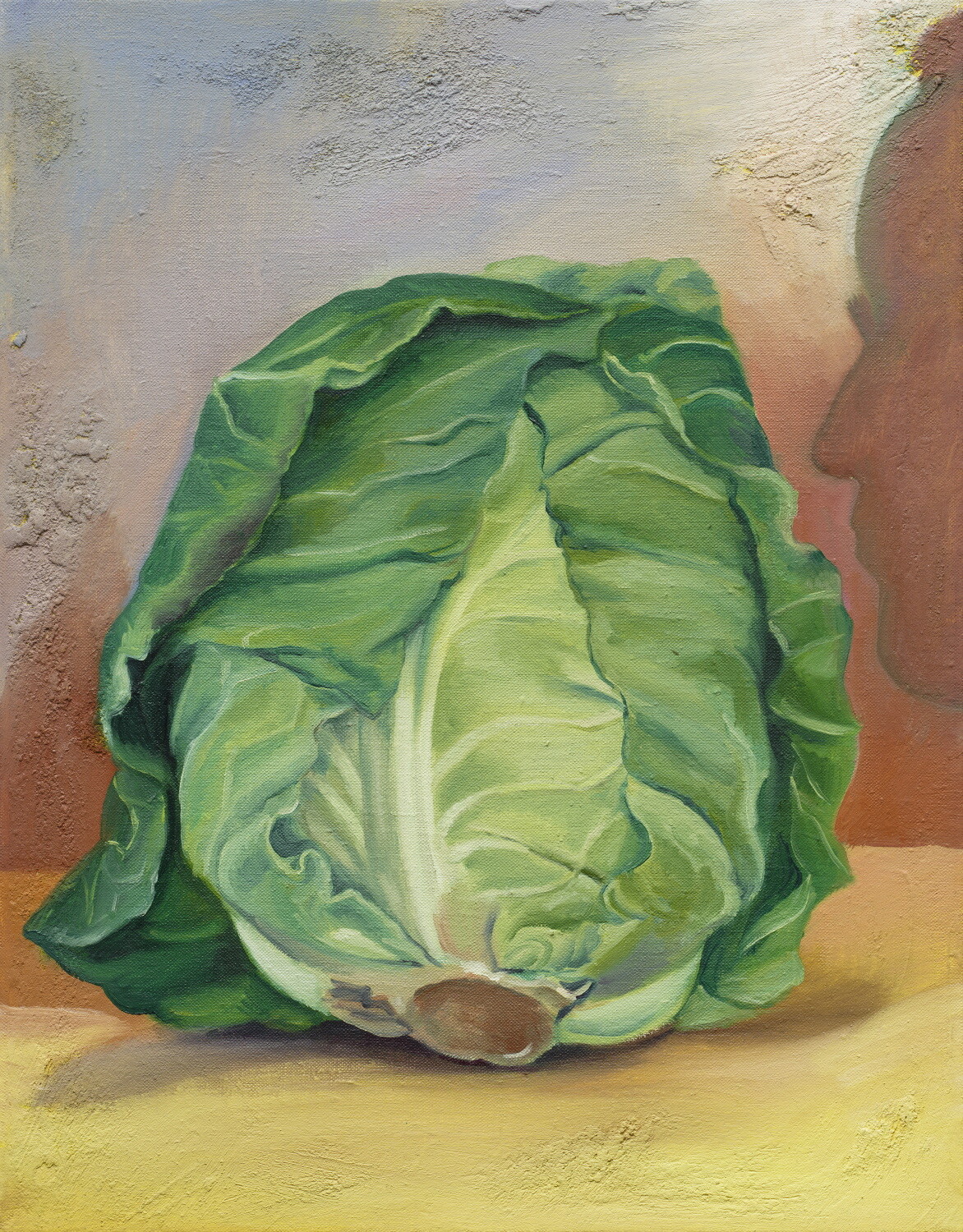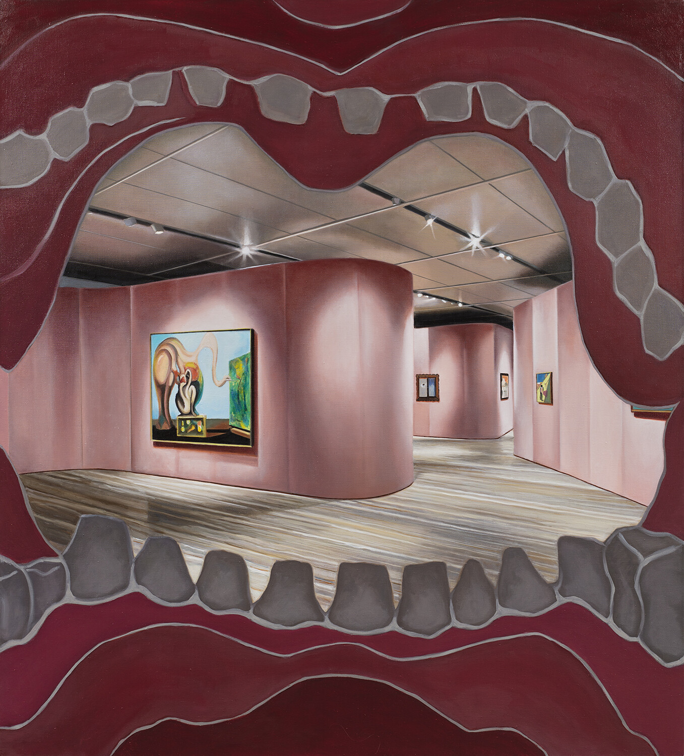 Like the well-crafted call-back of a good stand-up, that last image is riffed upon in the final gallery. Arranged in an arrow-like formation are six free-standing walls. On each is a painting that positions the viewer inside a mouth looking outwards. In the foreground of each painting are teeth and gums; beyond the pink-red caverns are a variety of—again wide-ranging and seemingly unconnected—scenes. The first of these is, naturally, an ornamental cockerel (akin to a little Rooster of Barcelos souvenir one might buy in a Lisbon tourist shop). The others variously depict two faces gliding in for a kiss; a strange, oily-looking cat; a woman kneeling, her legs demure to one side (a self-portrait, the image a 2021 advert in which Katz appeared for the Miu Miu fashion brand); and an art gallery hung with work by William N. Copley, of whose painterly lineage of poppy surrealism Katz could be considered a part. On the opposite side of each wall are hung paintings of cabbages, dated between 2013 and 2020, each with a silhouette profile of a man’s face looking towards these alluring vegetable still-lives. Such non-sequiturs are, I now realise, to be expected from this exhibition; all the same, these pairings have the feel of a delightful burlesque.
