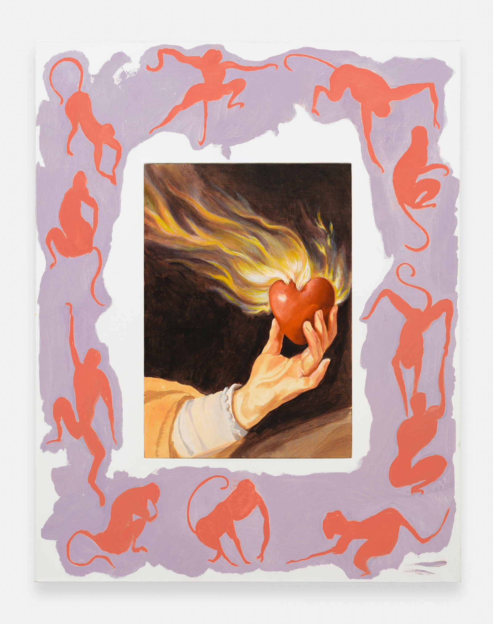 Why did the chicken cross the road? I don’t know—but Allison Katz has some suggestions. There are chickens aplenty in “Artery,” a show of 30 works, the majority new, by the Canadian painter. The other side (2021) is a painting of a cockerel in motion that recalls Eadweard Muybridge, the work hung across two freestanding walls so the bird seems to be surmounting the gap between them.1 Grains of rice—a kind of chicken feed, presumably—are scattered across the canvas surface, stuck on and around the golden animal. Despite the bird’s strut, it’s unclear—given the yellow plumage and blue-feathered head—whether what we are looking at is the result of Katz painting a chicken (or a photo of a chicken), or of her painting a chicken-shaped ornament; whether this painting is a representation, in other words, or a representation of a representation.
