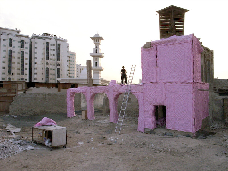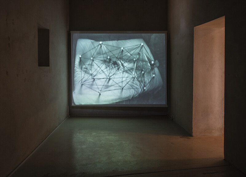 Anxiety wasn’t Kenawy’s only emotional register. Her work could also be tender and maternal, as when she wrapped up a dilapidated Sharjah building in a puffy, bubblegum-pink quilt (Non-Stop Conversation, 2007, present here through video documentation); or pensive and melancholic, like Booby-Trapped Heaven (2006), a video pitched somewhere between sleep and wakefulness, juxtaposing the surface of an anonymous woman’s massive body with shaky scenes of a barren industrial landscape filled with electricity pylons. Still, even these softer pieces can elicit an unquiet, shivery affective response.