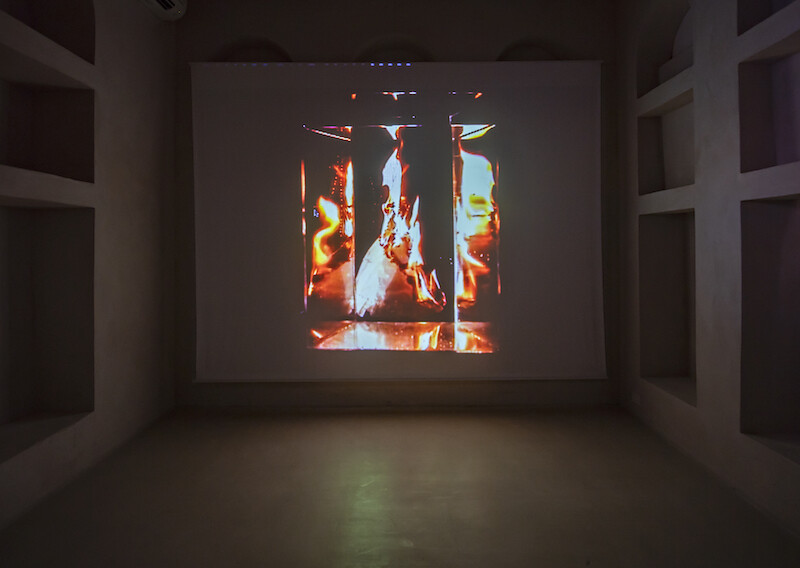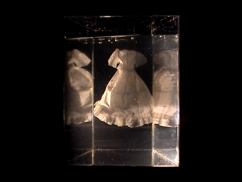 Take the earliest work on view, the one that gives the retrospective its name: Frozen Memory from 2002, Kenawy’s last collaboration with her older brother, Abdel Ghany, which introduces her longstanding preoccupation with an arcane interior perspective, a tenebrous symbolic space informed by her journals and dream diaries. It was first presented as an immersive, two-room mise-en-scène punctuated by surreal sculptural elements (like an illuminated white gown filled with living butterflies) and a slide show, but at the Bait Al Serkal there’s only a short video projected in a dark, empty room. As an unintelligible female voice bubbles up from the sonic depths, a hand-cut paper tree listlessly floats underwater in a glass chamber, its branches splayed like bronchial tubes; a handwritten letter suddenly drifts in, bleeding ink down its face; tongues of flame illogically sputter up and spit out a perfect white wedding dress.