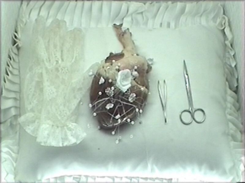 Kenawy kept repurposing the same narrative tectonics and imagery, as in her startling performance piece of the following year, The Room. Again, only the video component is shown in Sharjah, a projection that flashes between an animated space populated by elliptical symbols (that same paper tree, a butterfly, a pair of doll’s legs), and a real, white-tiled bathroom, where Kenawy sits, in profile, dressed as a young bride. Switching focus, the camera zooms in on her lace-gloved hands embroidering a beating heart (an alarmingly real one) with tiny pearls. When Kenawy showed the work at Cairo’s Townhouse Gallery in 2003, she sat in front of a white-tiled wall, dressed in a white kaftan and scarf, manipulating an actual animal heart as the video played beside her. In 2007, restaging The Room in the ruins of a Byzantine church in Amman, she set the dress on fire.