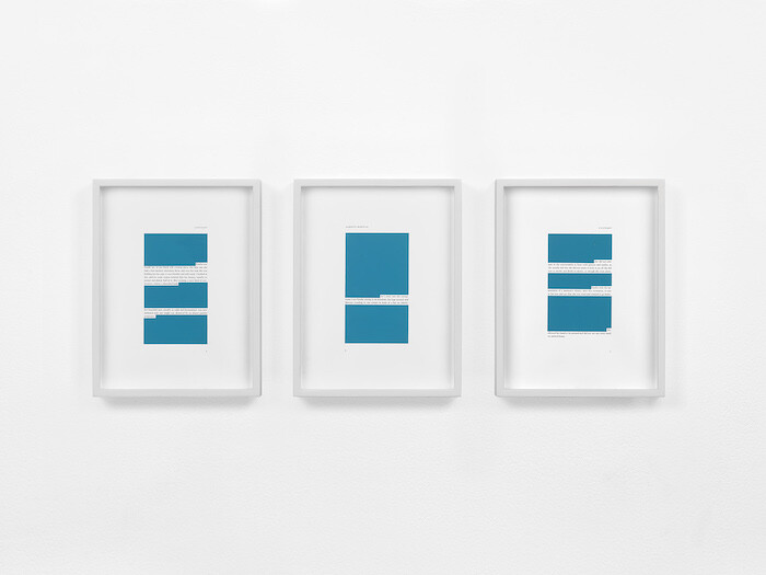 Godard seems obsessed with the double-bind persona of Bardot. He subtly discloses Le Mépris’s backstory in its promotional trailer, in which he calls it, not without irony, “the new traditional film of Jean-Luc Godard.”2 A few films later, Jane Fonda and Yves Montand re-enact Le Mépris’s bed talk in the opening scene of Tout va bien [Everything is Fine] (1972), this time set in an industrial, suburban environment. (Both films brilliantly juxtapose social, affective, and identity polarities in pre- and post-May 1968 France.) Throughout Le Mépris, Bardot ambiguously veils and unveils herself with a thick red towel that wraps her body like a veil on a classical sculpture, further highlighting the economic-emotional-aesthetic-sexual tension surrounding her image. “Body Scripts” explores concealment and disclosure in relation to a woman’s presence in a similar manner. The work consists of a series of framed texts extracted from A Ghost at Noon, the English translation of Alberto Moravia’s 1954 novel Il disprezzo, which, inspired by Homer’s Odyssey, in turn was the basis of Godard’s screenplay for Le Mépris. Where Bardot covered her body with a red cloth, Siegel applied a Tyrrhenian Sea-blue gouache to large sections of the texts, leaving visible only those segments that feature Emilia (the book’s female character, renamed Camille in Le Mépris). Rhythmically arranged, they fill the perimeter of the gallery’s first room: an abstract score in which the cadence of the Mediterranean waves encounters the pace of Thème de Camille.