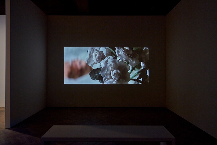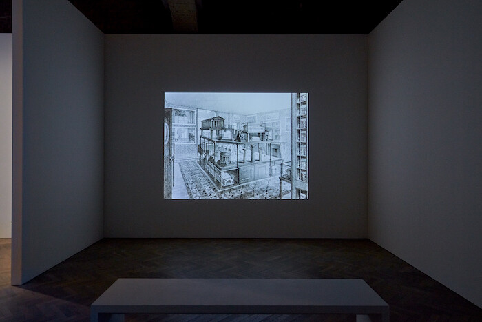 A large projection of Genealogies fills an entire wall of the following room. The video brings together an eclectic profusion of still and moving images—photographic documentation, snippets from films, advertisements, and music videos—weaved together by the artist’s voiceover. Half lecturing, half storytelling, Siegel shares her decentered, non-linear research, where one finding leads to another in a multilayered account that celebrates horizontal, non-hierarchical approaches to visual culture. Potentially a rabbit hole of meta-academic knowledge and highbrow erudition, the work instead inserts itself in the most lucid and generous tradition of artistic research, where Aby Warburg’s Mnemosyne Atlas (1924–29) meets Ad Reinhardt’s slideshows. In a particularly eclectic moment, Pink Floyd’s Live at Pompeii concert (1972) follows Ingrid Bergman in Roberto Rossellini’s Viaggio in Italia [Journey to Italy] (1954) and precedes a 2012 commercial by Persol paying tribute to Casa Malaparte, named after its original owner, writer Curzio Malaparte.