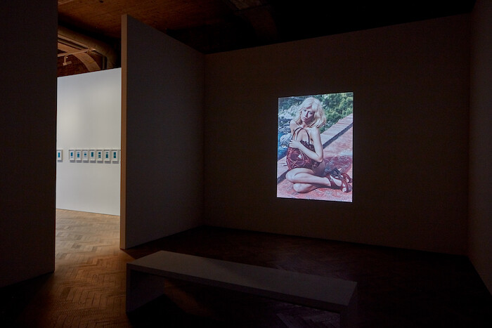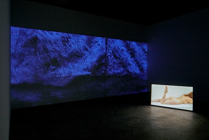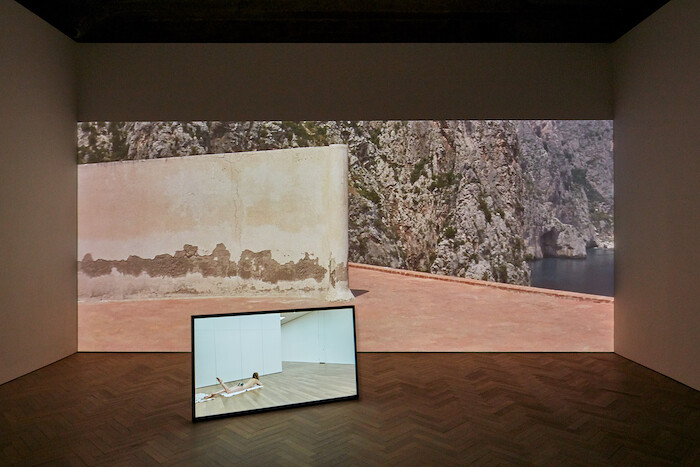 Casa Malaparte is also the set of the multi-channel video installation The Noon Complex, which, like “Body Scripts,” follows a logic of division and subtraction. A large projection features scenes from Le Mépris set in the house, but minus Camille/Bardot, who has been digitally erased from the film. Without her, the camera appears lost, panning around in search of the actress, trying to find the driving force that moves the film forward. At the same time, the house, in its ascetic opulence, becomes a surrogate for Bardot’s attention economics. A flat screen placed on the floor next to this projection shows a white, blonde, middle-aged woman, sometimes dressed, others naked, who replicates Bardot’s gestures and movements in Le Mépris. She’s like a prop that has been placed in front of a green screen, ready to be Chroma-keyed to the original film. Instead, she’s filmed in a large, empty, blue-chip-like gallery, which makes the whole scene uncanny: this new-old figure reifies Bardot’s old-new image in an equation where female bodies are as arbitrarily rendered and substituted as items in a catalogue. With this transposition, it’s unclear how Siegel is surpassing the ambivalence of a gendered body that has been monetized and profited throughout centuries of art, film, and culture’s promiscuous relation to capital. But at that point, Camille, the melody, returns to the room, and with it Bardot’s self-inventory perpetuates this conflict between pleasure and emancipation: “Do you see my feet in the mirror? Do you think they’re pretty? Do you like my ankles? And my knees, too? And my thighs? Do you see my behind in the mirror? Do I have a cute ass? Shall I get on my knees? And my breasts, do you like them? Which do you like better, my breasts, or my nipples? Do you like my shoulders? I don’t think they’re round enough. And my arms? And my face? All of it? My mouth, my eyes, my nose, my ears?”