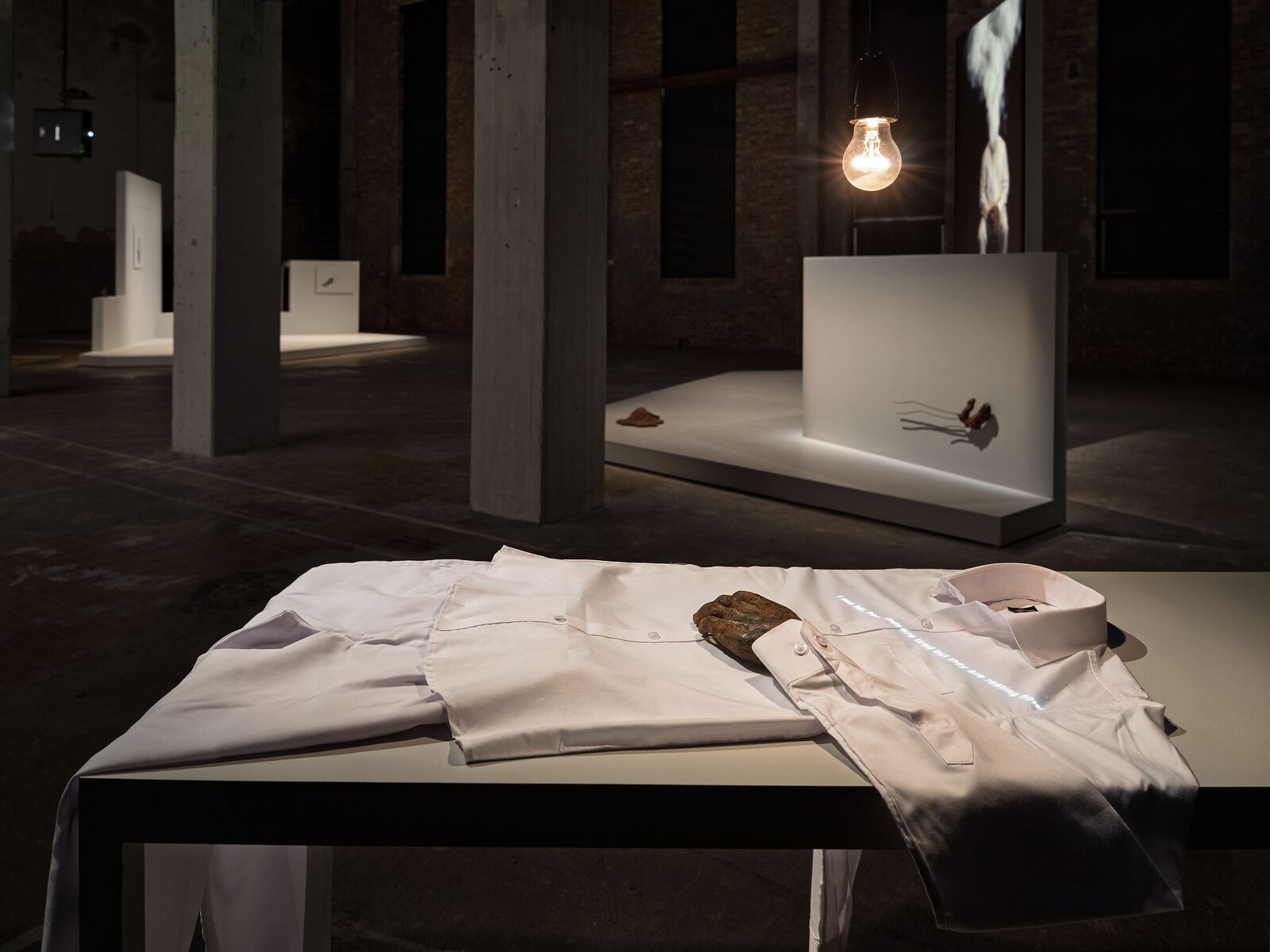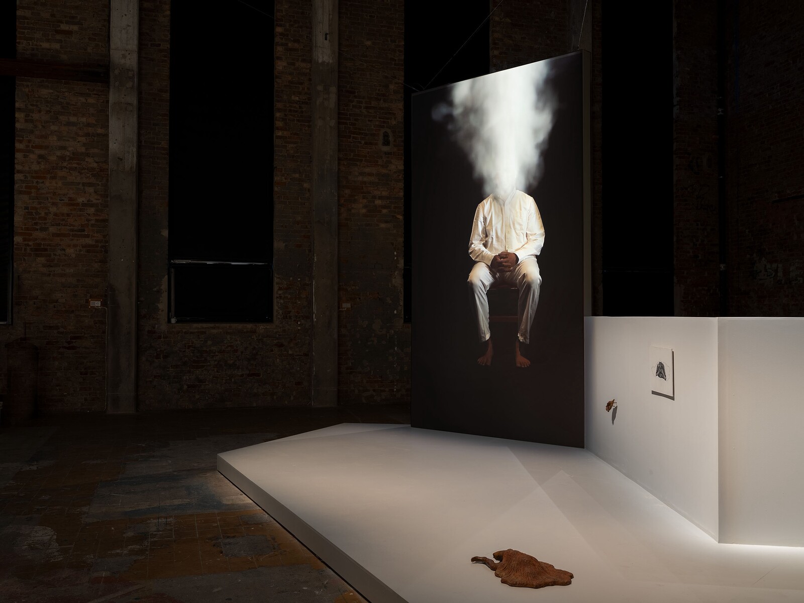 This dissonance evaporates on the exhibition’s upper floors, which show past work. Let’s Clean Our Hands (2022), a holographic video of a man washing himself in a river, is projected into a small drinking glass of the kind typically offered to upper-class guests upon arrival. The focused beam of light produces a tantalizing luminosity in the darkened room. The image evokes the delicious intimacy of cool, moving water against naked skin in the sparkling sun. Access to water has been a major axis of the Dalit political movement, as members of the lower caste are often denied not only water to bathe in or for household chores, but clean drinking water. The political register is implicit in the pleasure the piece evokes in the viewer. The video elicits the desire for water, and its form is a vessel for hospitality that invites the fantasy of desire’s fulfilment. There is no slippage, here, between political reference and embodied experience.