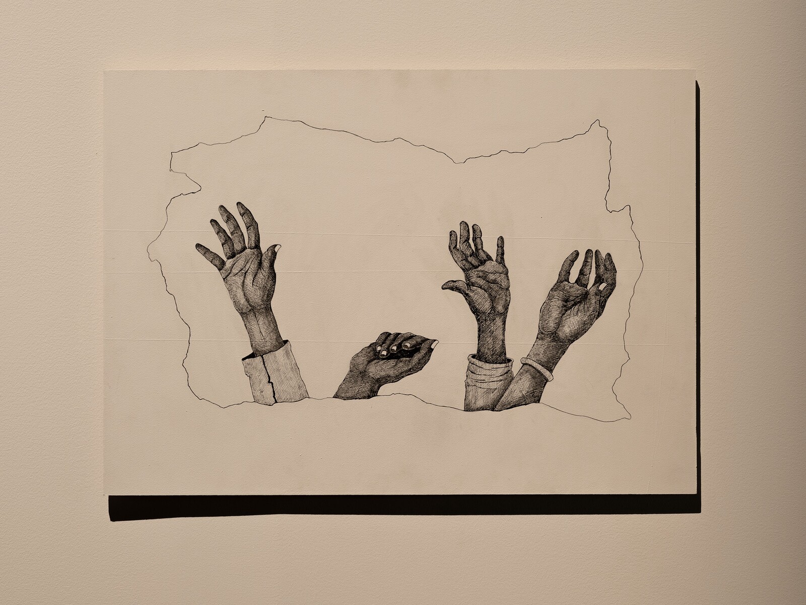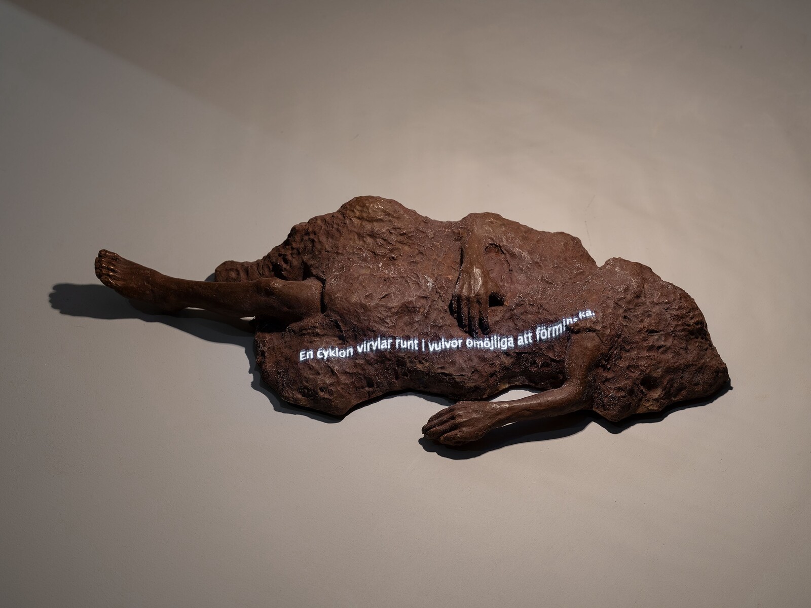 Instead, the affective impact of the work is of diffuse, nostalgic mourning. An audio cassette emerges halfway from a mass of unpolished bronze in a sculpture the size of a small bundle. Hands and feet are scattered across the walls, also cast in bronze, tethered to long metal rods shaped to evoke the rest of the body. Pen-and-ink drawings of torsos, arms, a belt are framed by shapes reminiscent of territorial borders. A prone corporeal shape is covered by a large mass, perhaps a blanket or a pile of earth. Poetry is projected onto it from above as a subtitle line of white script against the muddy color of the unfinished metal.