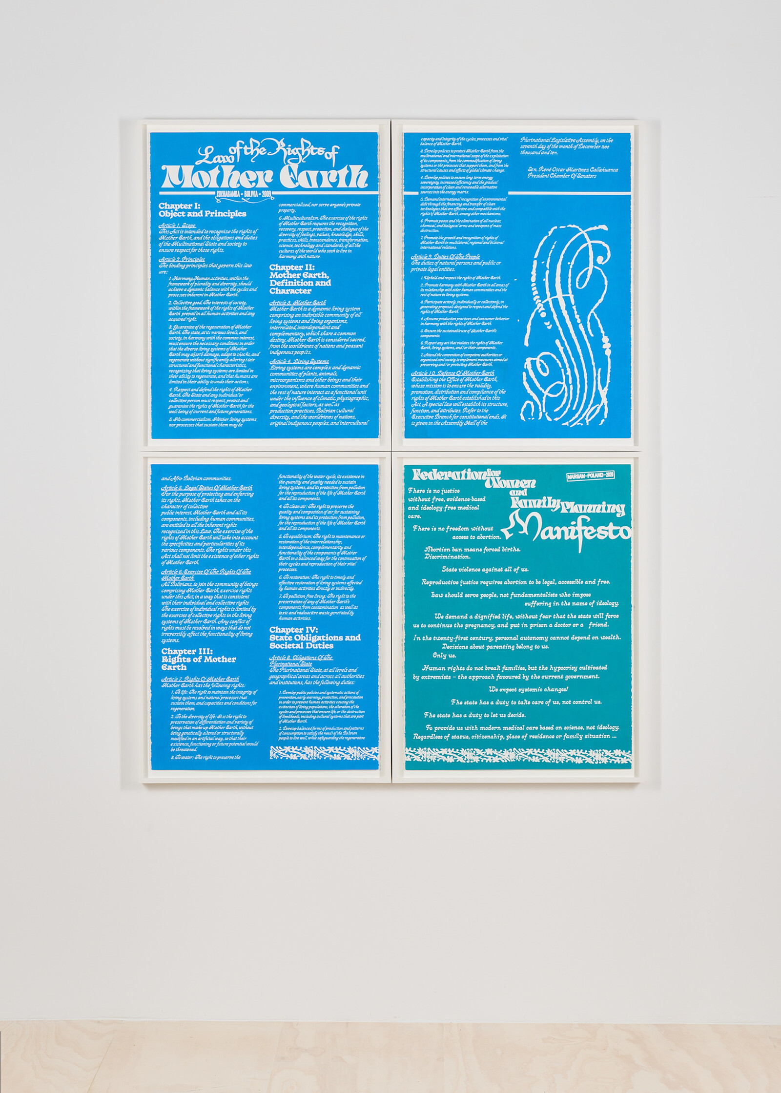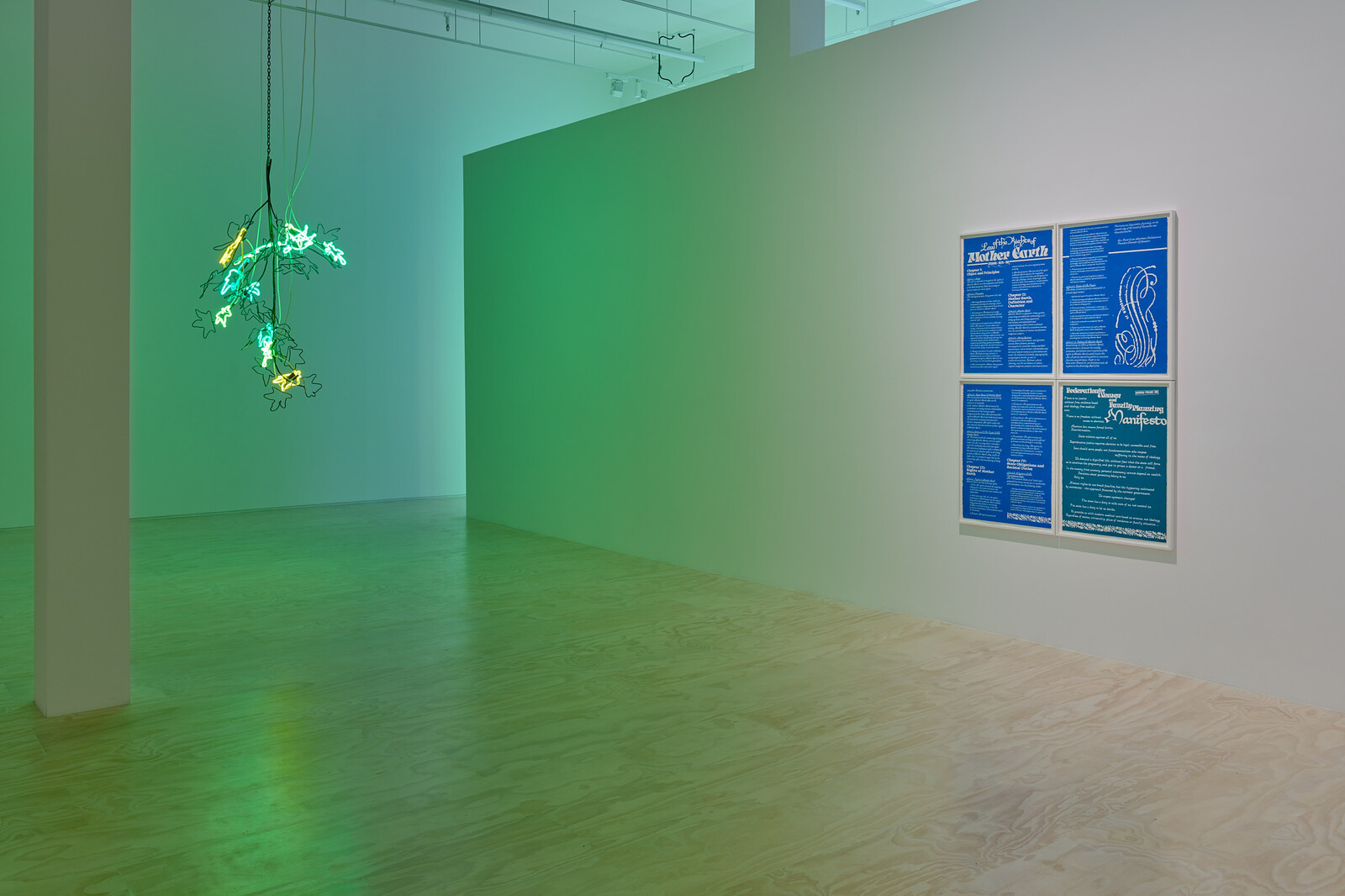 Within the gallery, a sister piece is mounted on the wall. Rights of Nature & Bodily Autonomy (Law of the Rights of Mother Earth, Bolivia, 2010; Federation for Women and Family Planning Manifesto, Warsaw, Poland, 2020) (2022) replicates declarations of fundamental social, political and environmental sovereignty in words and images with labor-intensive color fields and careful lettering drawn by hand in pencil on paper. Nearby, a second hanging neon piece embodies the message held forth by its title, Chandeliers of Interconnectiveness (Everything Is Part of Everything Else) (2022), inscribed in steel, shaped into forms of hanging branches with leaves highlighted in neon.